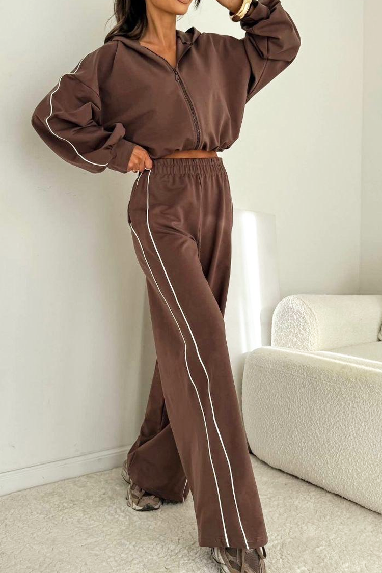 - Bluza zapinana jest na zamek i ma kaptur, a spodnie mają wysoki stan i szerokie nogawki.
