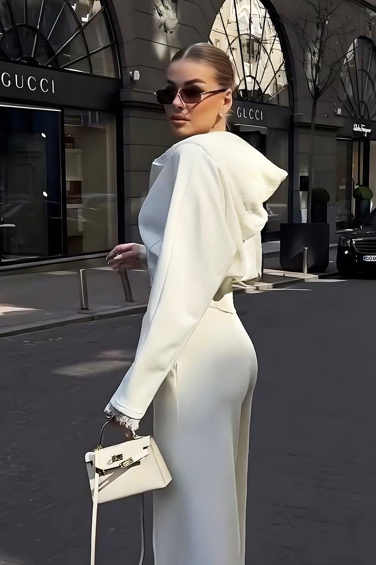 - Bluza zapinana jest na zamek i ma efektowny kaptur, a spodnie mają wysoki stan z wiązaniem i szerokie nogawki.