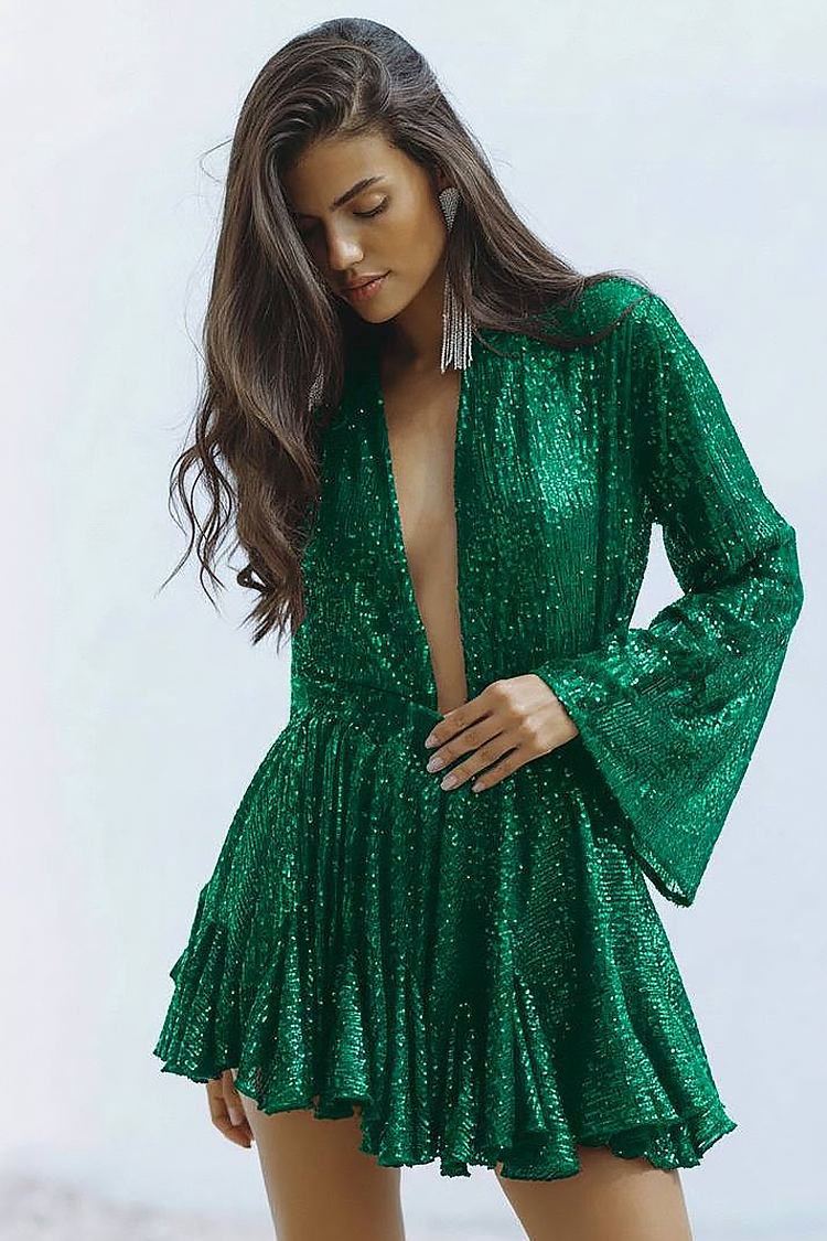 - Aby uzyskać idealny look, wybierz tę krótką sukienkę z atrakcyjnym wzorem w kolorze zielonym.