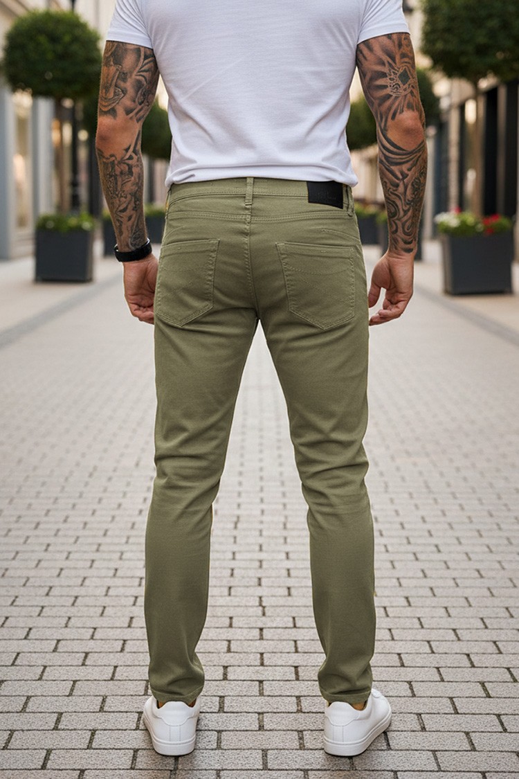 - Męskie spodnie chino w kolorze khaki z podwiniętymi nogawkami, pasujące zarówno do codziennych, jak i bardziej eleganckich stylizacji.