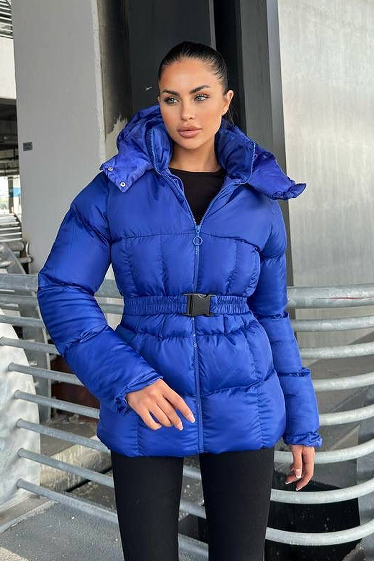 - Model ma pikowany krój, kaptur, pasek z tego samego materiału i wygodne zapięcie na guziki.