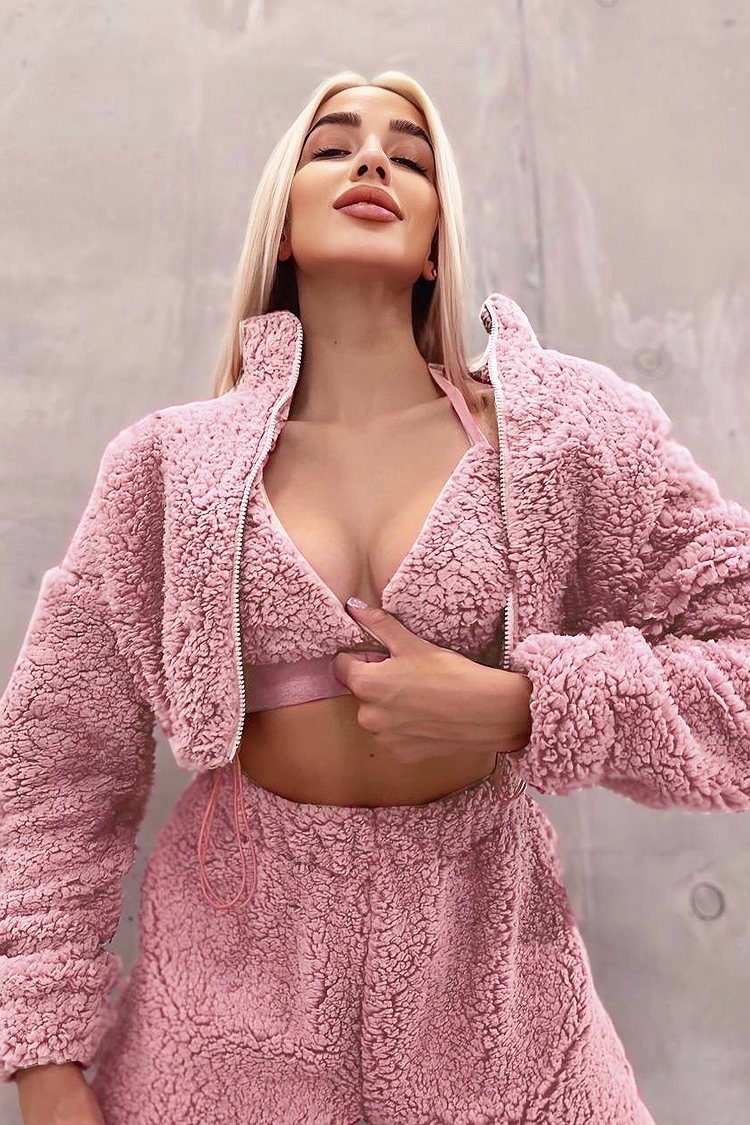 - Bluza zapinana jest na zamek i ma kaptur, spodnie mają wygodny krój, a gorset ma krótki krój z wycięciem.
