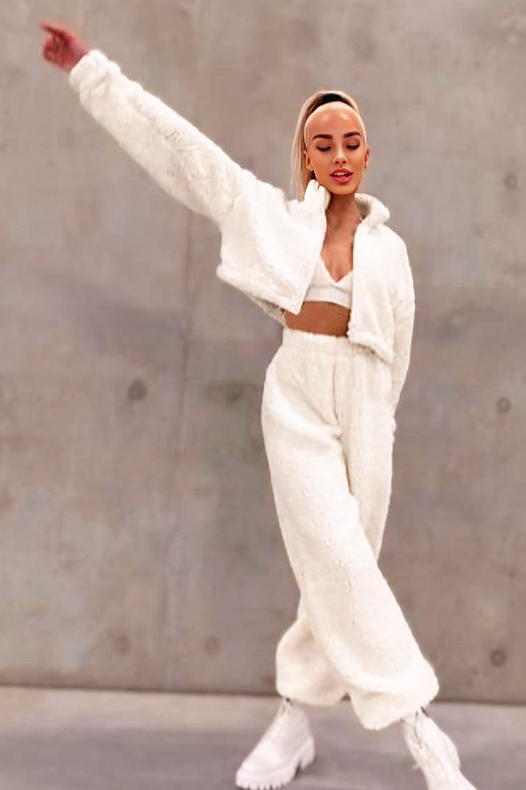 - Bluza zapinana jest na zamek i ma kaptur, spodnie mają wygodny krój, a gorset ma krótki krój z wycięciem.