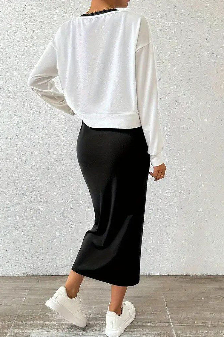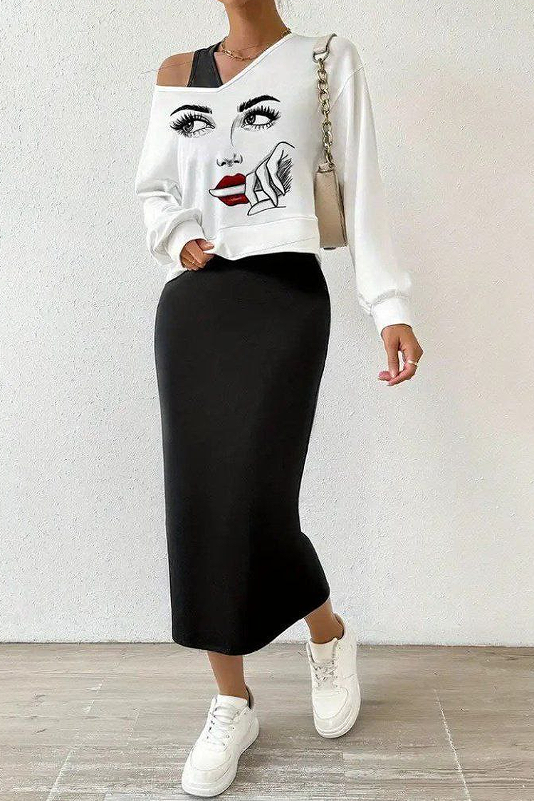 - Sukienka jest w klasycznym czarnym kolorze, a bluzka ma efektowne obniżone ramiona i kolorowy nadruk.