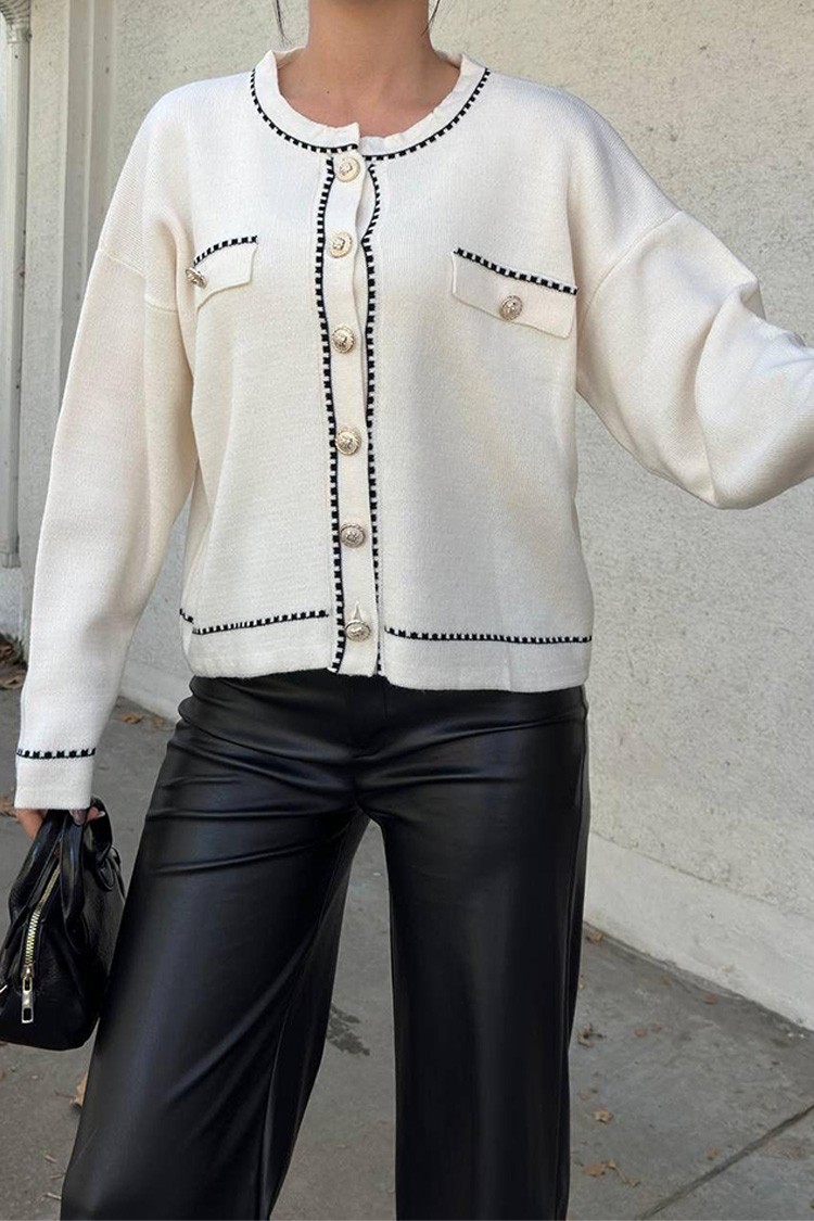 - Model ma elegancki krój, długie rękawy, efektowne guziki, ozdobne kieszenie i białe detale.