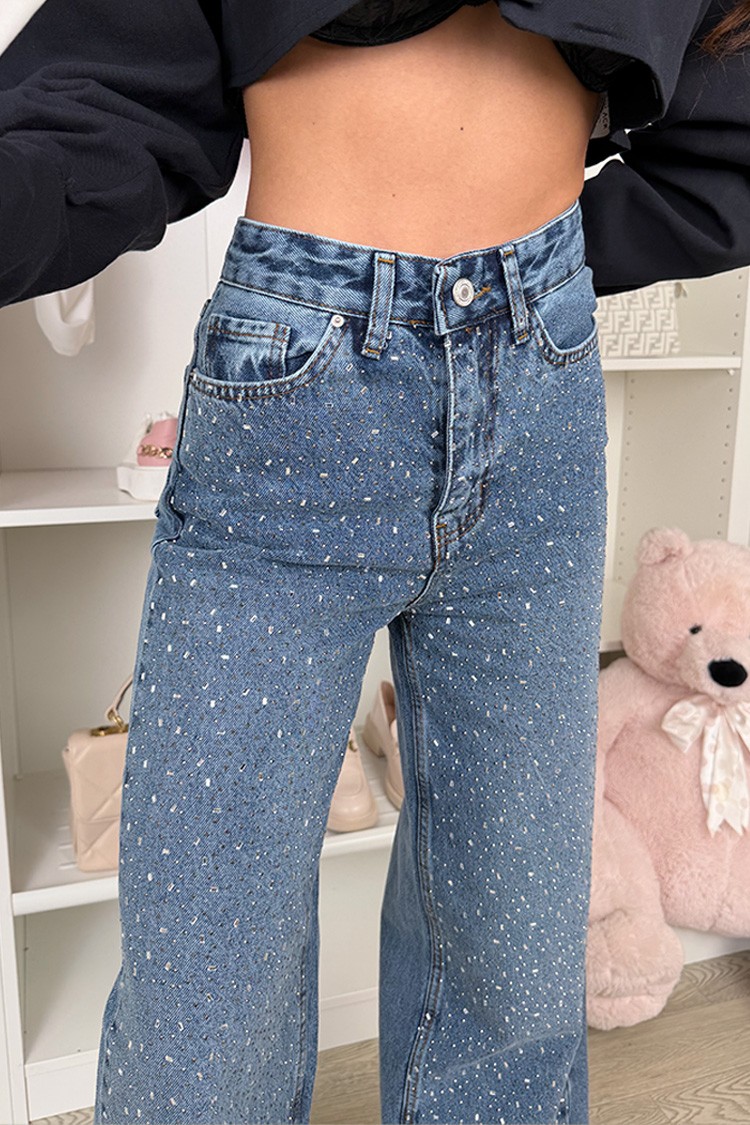 - Model ma wysoki stan, szerokie nogawki i błyszczące, ozdobne elementy.