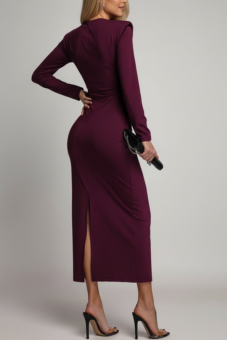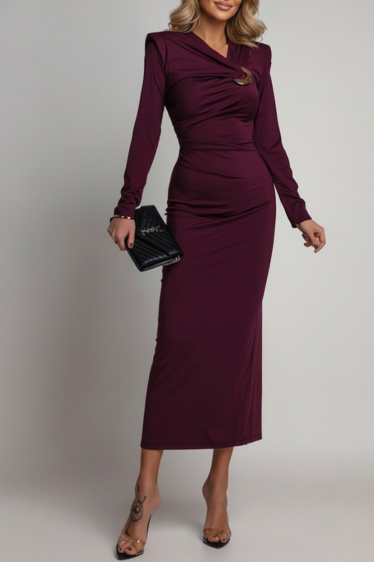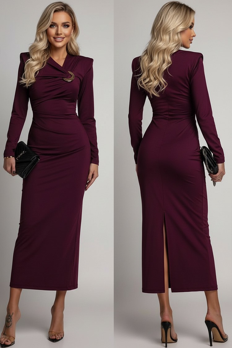 - Model ma spektakularny dekolt z metalowym detalem, długie rękawy i rozcięcie z tyłu.