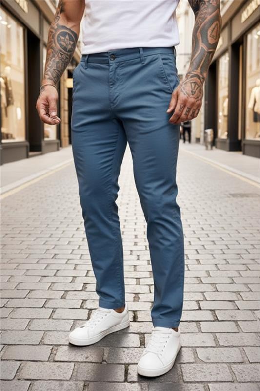 - Podstawowy model męskich spodni z prostymi nogawkami w kolorze jasnoniebieskim, odpowiedni zarówno do codziennych, jak i bardziej eleganckich stylizacji.