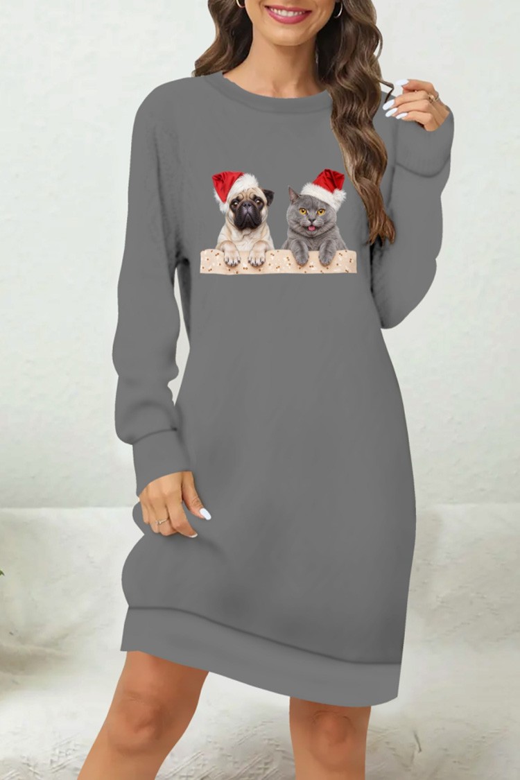 - Sukienka ma wygodny i luźny krój, długie rękawy i świąteczny nadruk.