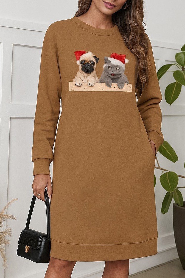 - Sukienka ma wygodny i luźny krój, długie rękawy i świąteczny nadruk.