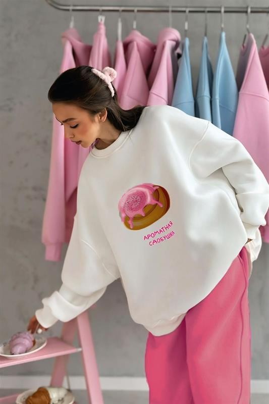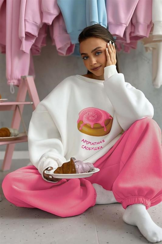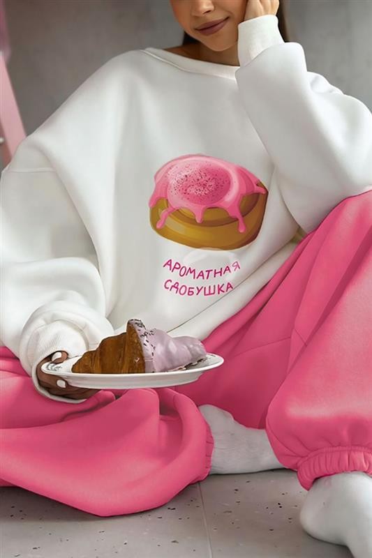 - Komplet składa się z oversize'owej bluzki z atrakcyjnym nadrukiem, połączonej ze spodniami o luźnym i wygodnym kroju.