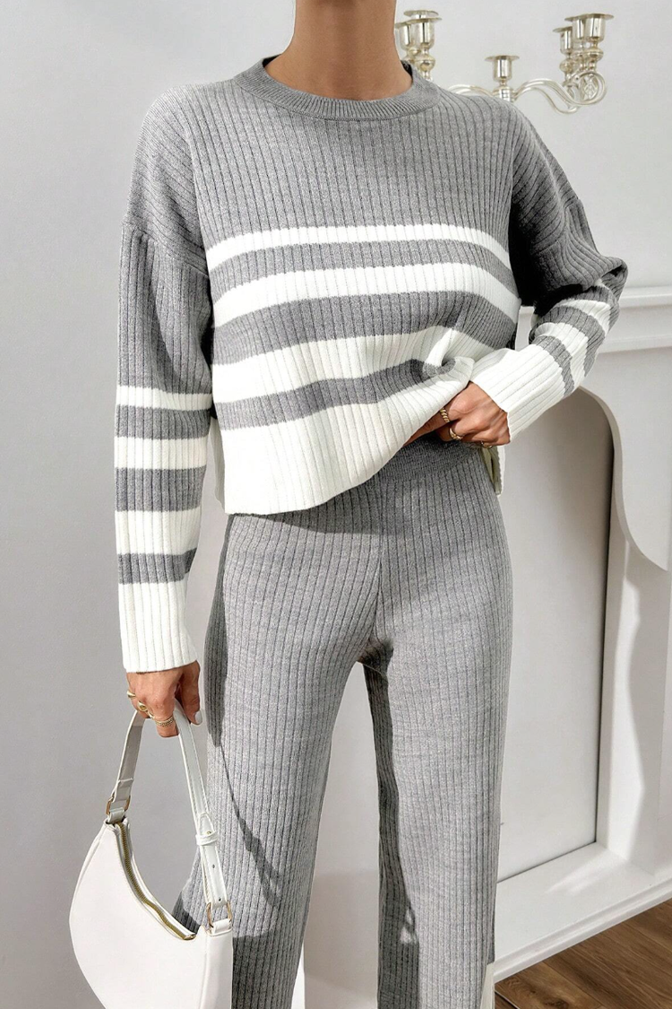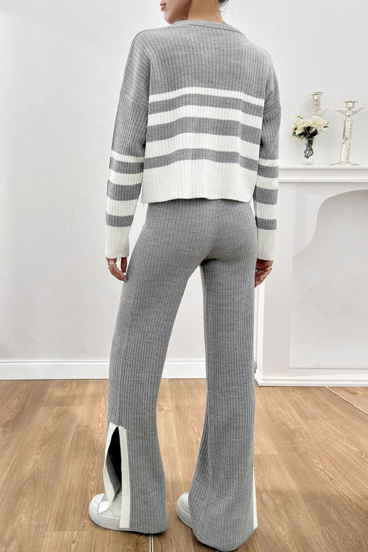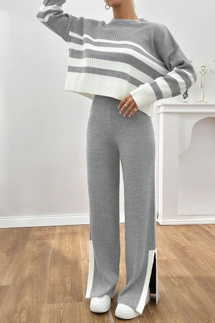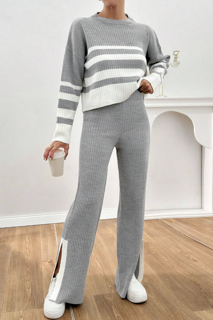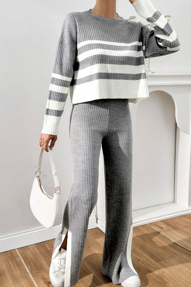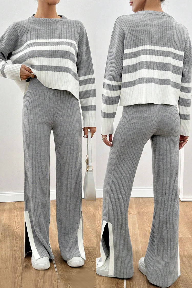 - Sweter ma klasyczny krój, a spodnie mają wysoki stan i efektowne nogawki.