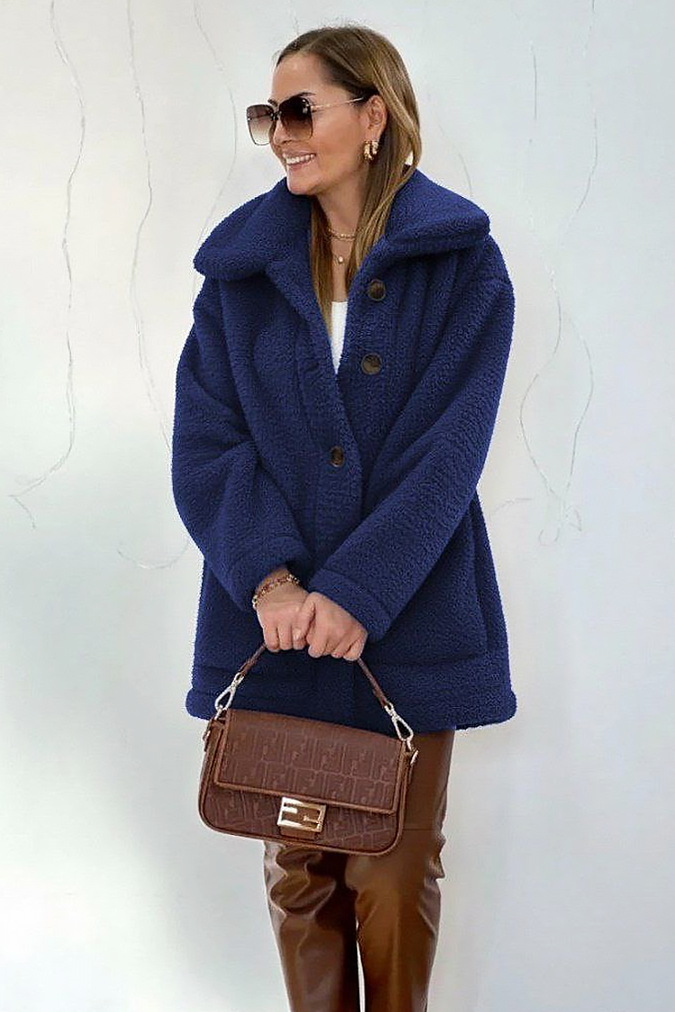 - Model ma klasyczny krój, praktyczne kieszenie, obszerny kołnierz i guziki z przodu.