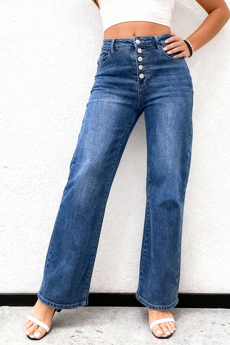 - Model ma wysoki stan, luźny krój, guziki i nowoczesny efekt sprania.