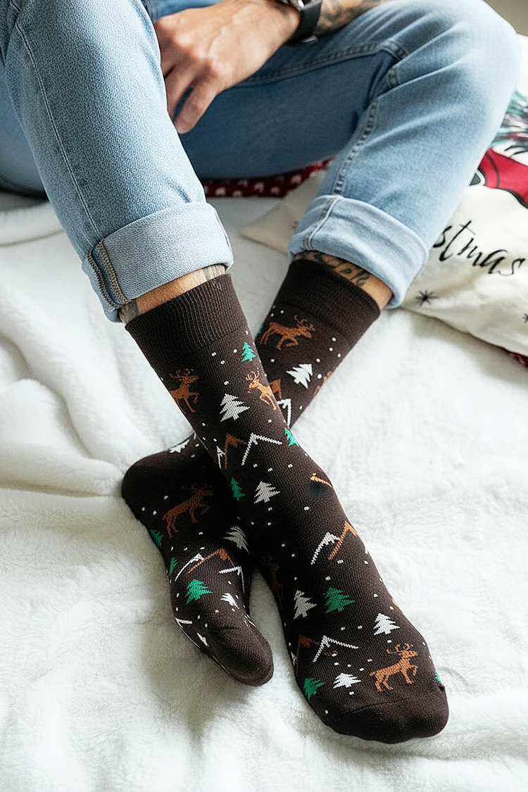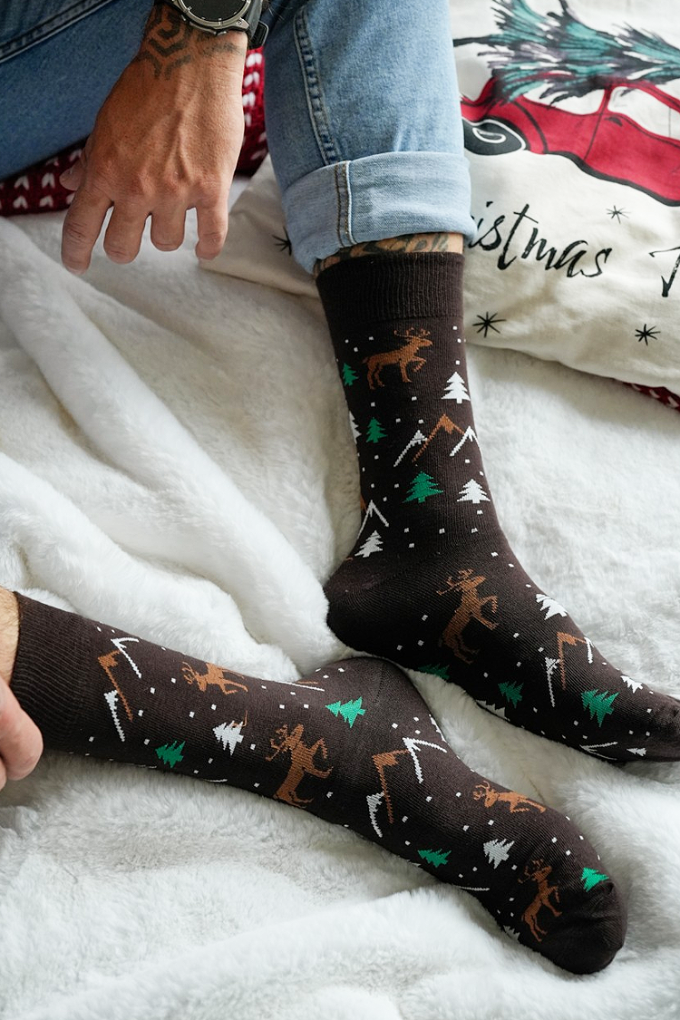 - Brązowe skarpetki męskie z motywami świątecznymi i elastycznym ściągaczem.