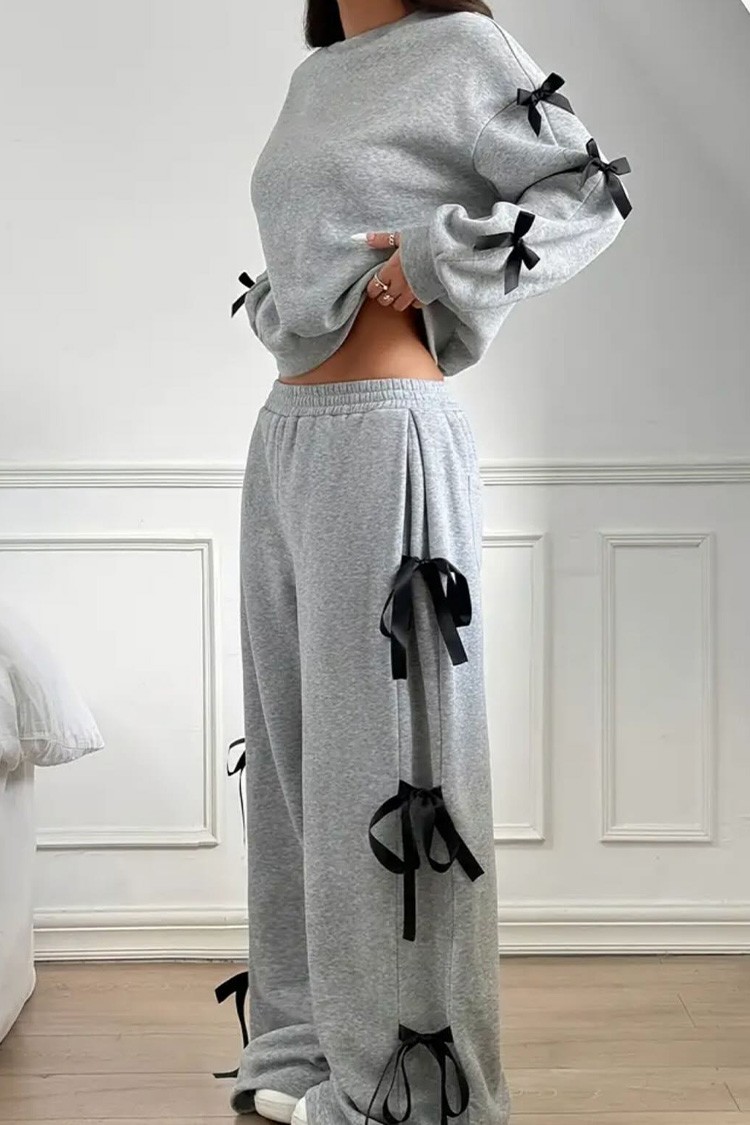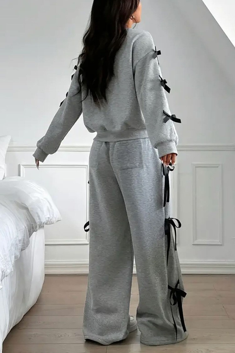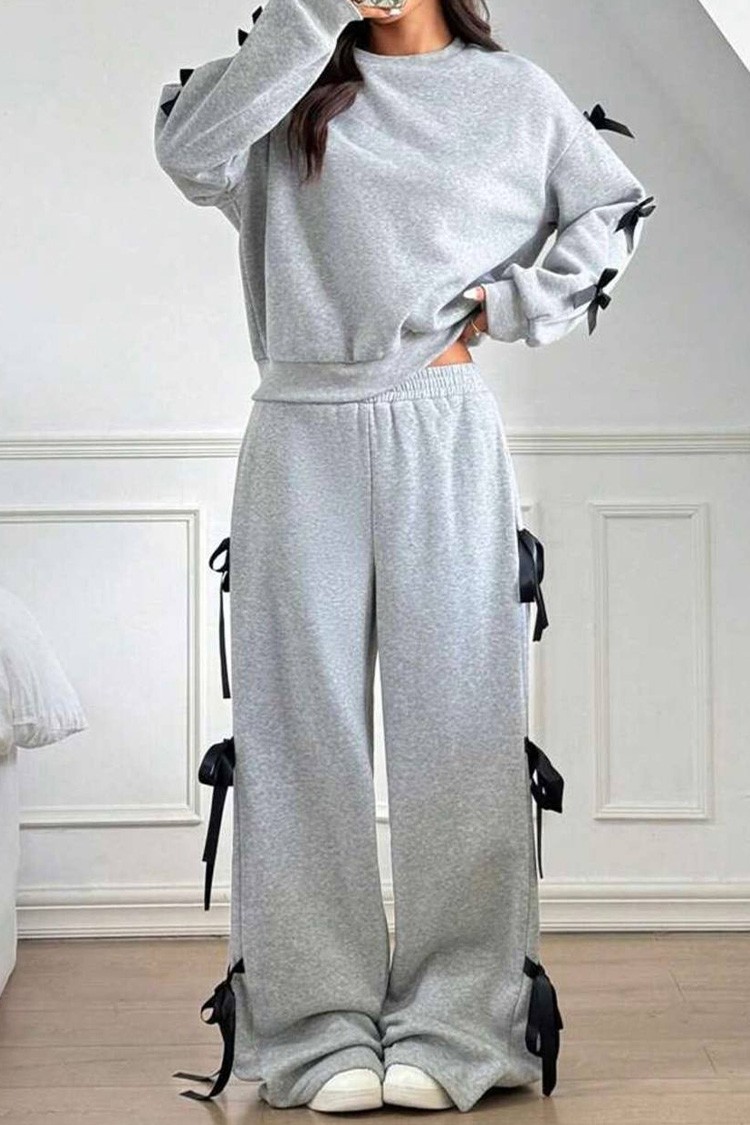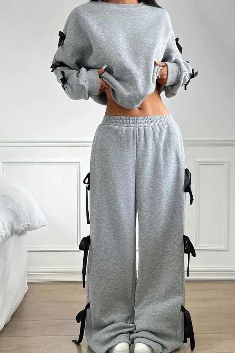 - Komplet składa się z oversize'owej bluzki i spodni o luźnym kroju, ozdobionych kokardkami na całej długości.