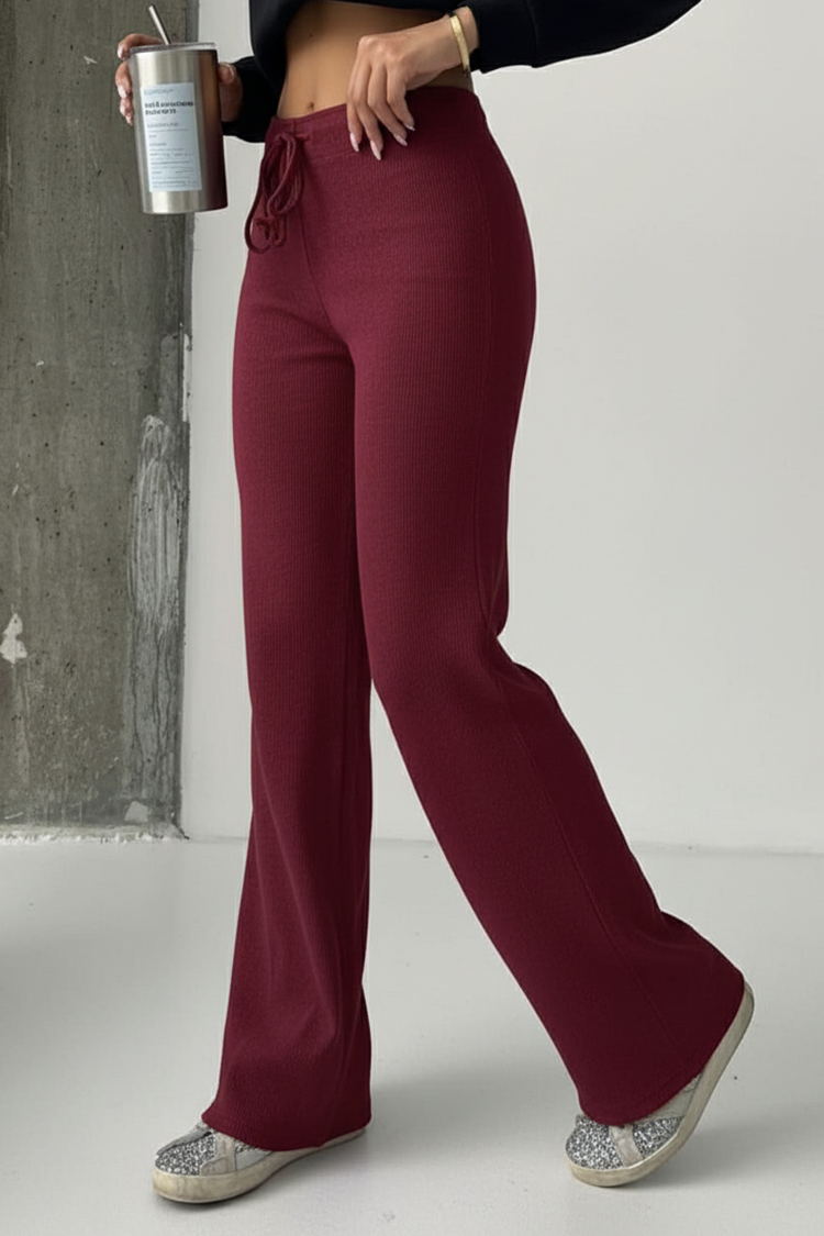 - Model ma wysoki, elastyczny pas z wiązaniem i szerokie nogawki dla maksymalnej swobody ruchów.