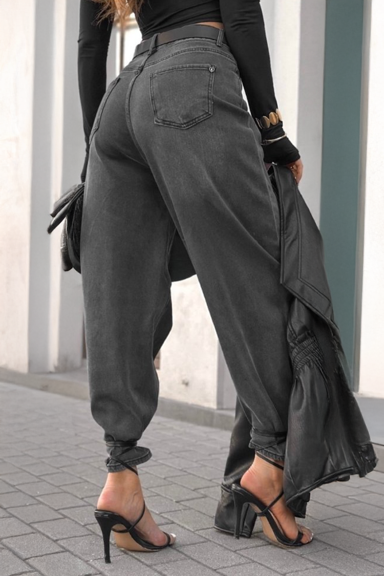- Model ma wysoki stan, jednolity kolor, kieszenie, oversize'owy krój i efektowne nogawki.