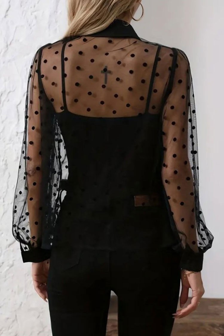 - Koszula ma długie rękawy, standardowe zapięcie na guziki i jest wykonana z przezroczystego materiału, a top ma prosty krój i jest w czarnym kolorze.