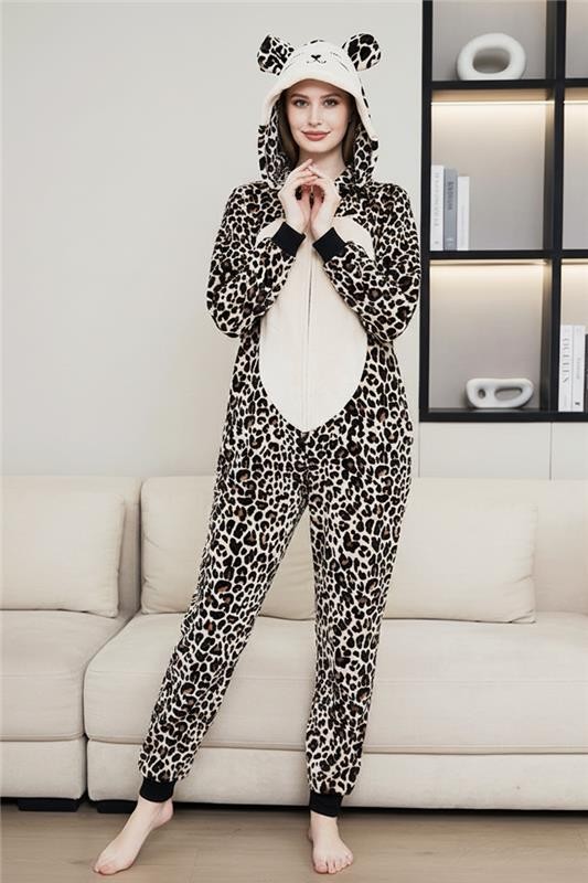 - Model ma długie rękawy, efektowny wzór zwierzęcy, kaptur z uszami, zamek błyskawiczny z przodu i ogon.