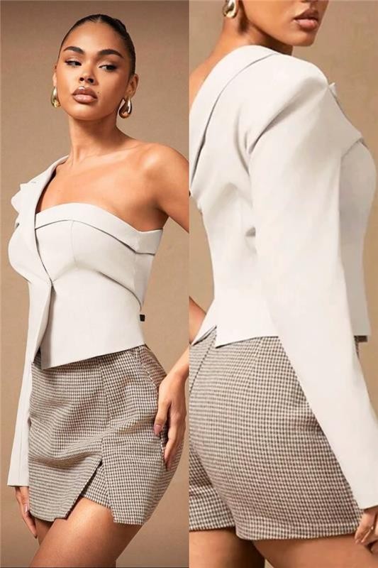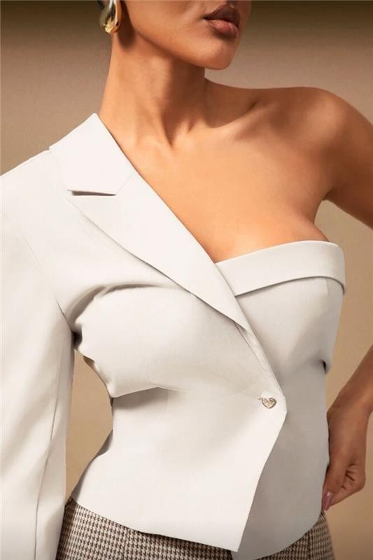 - Model ma asymetryczny krój, jedno ramię i czystą linię sylwetki, która podkreśla figurę.