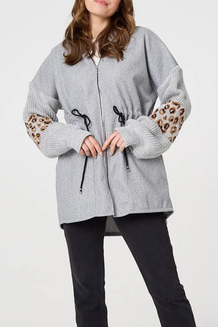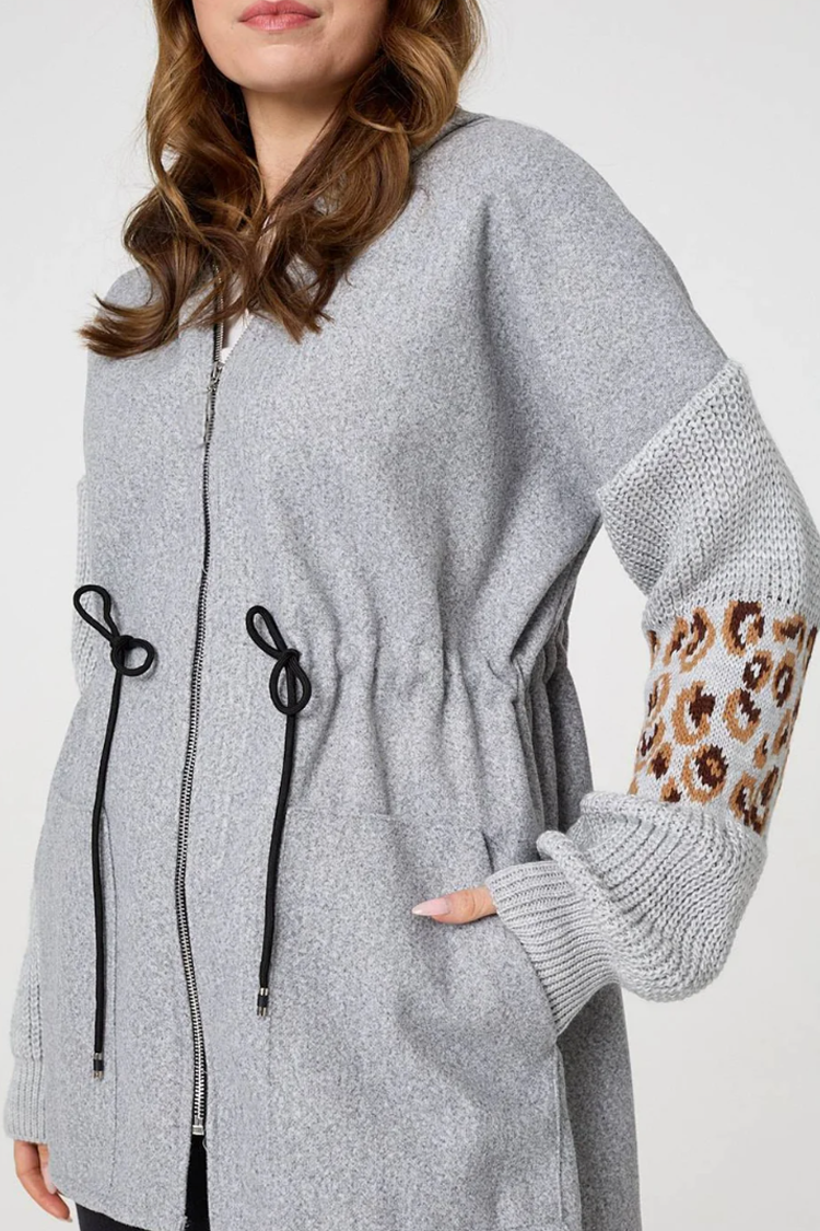 - Model posiada kaptur, gumkę w pasie, regulowane wiązania i efektowne detale ze wzorem zwierzęcym.