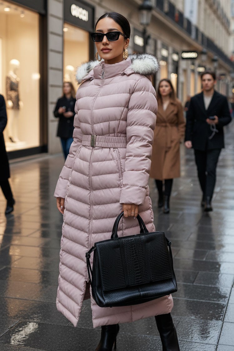 - Model ma luźny krój, praktyczne kieszenie oraz efektowny pasek i kaptur z puchem.