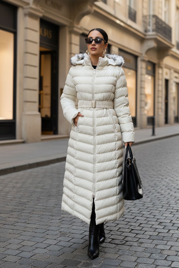 - Model ma luźny krój, praktyczne kieszenie oraz efektowny pasek i kaptur z puchem.