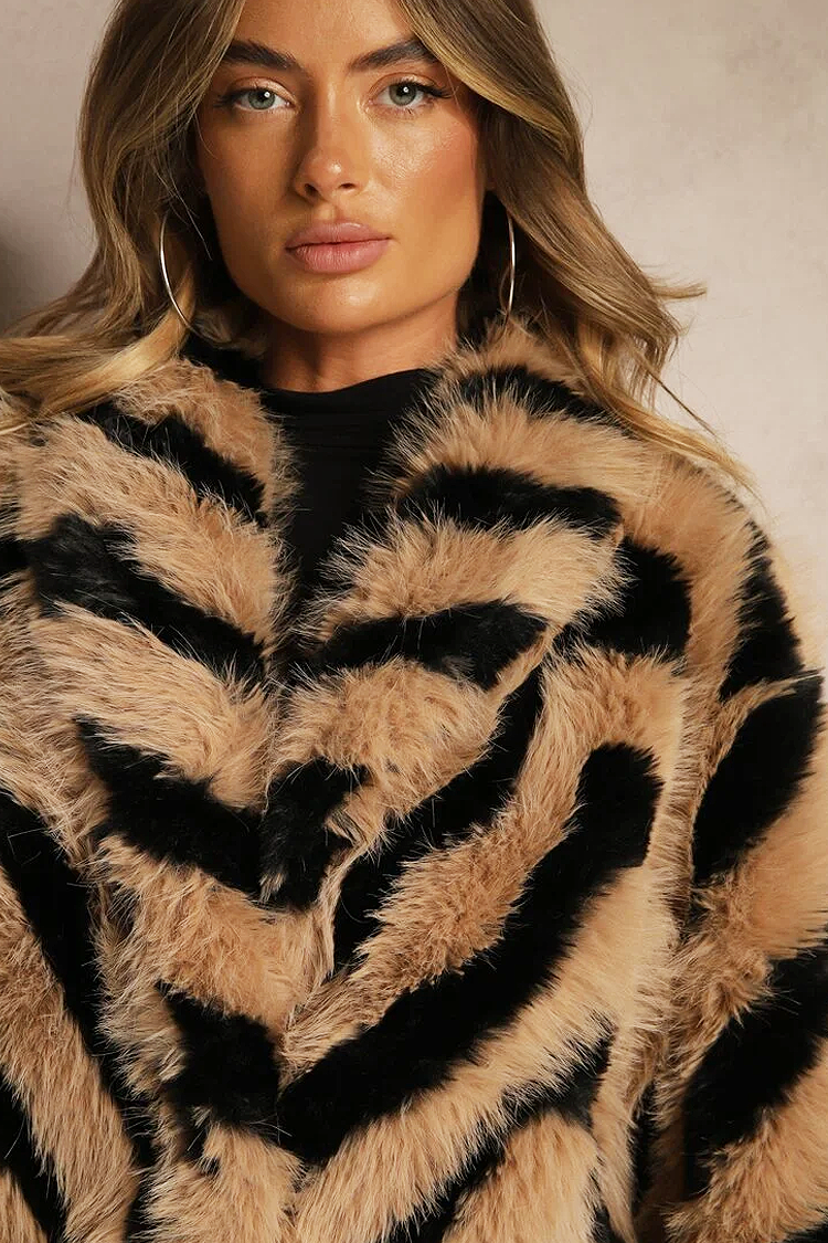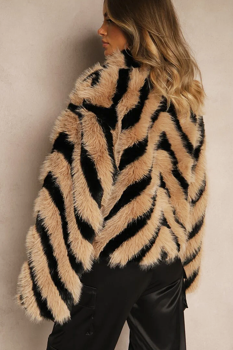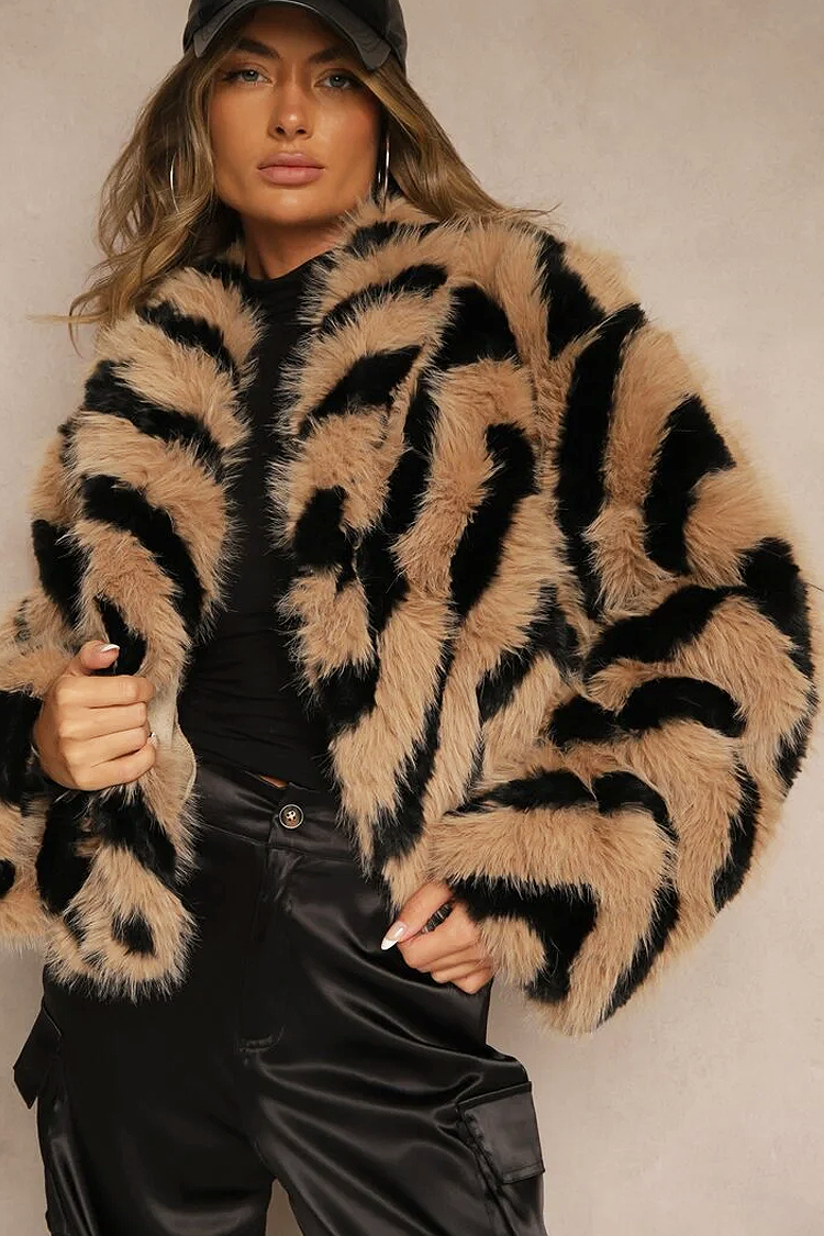 <li>Wybierz ten puszysty płaszcz o atrakcyjnym wzorze, pasujący do różnych modowych stylizacji.</li>