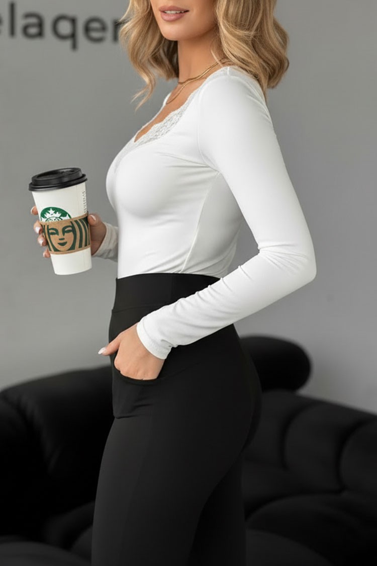 - Model ma klasyczny krój i delikatną koronkę na dekolcie.