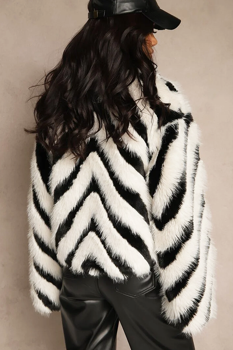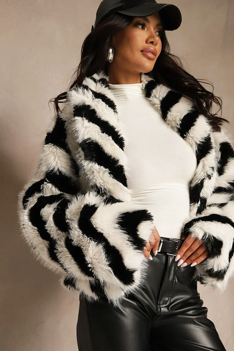 <li>Wybierz ten puszysty płaszcz o atrakcyjnym wzorze, pasujący do różnych modowych stylizacji.</li>