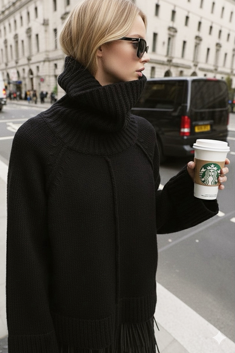 - Model ma długie rękawy, krój oversize, efektowne długie rękawy i kołnierzyk typu golf.