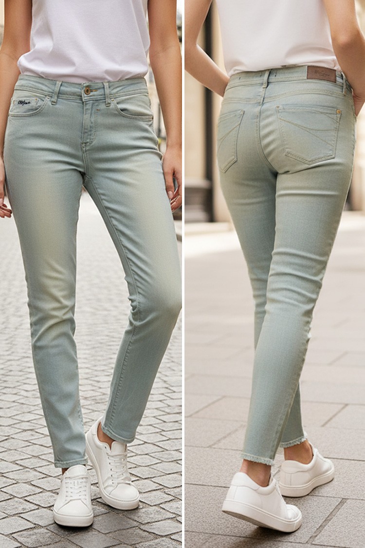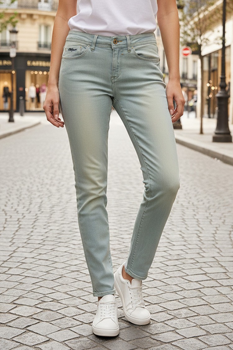 - Podstawowy model damskich jeansów o dopasowanym kroju w kolorze jasnoniebieskim, idealny na co dzień lub na spacer.