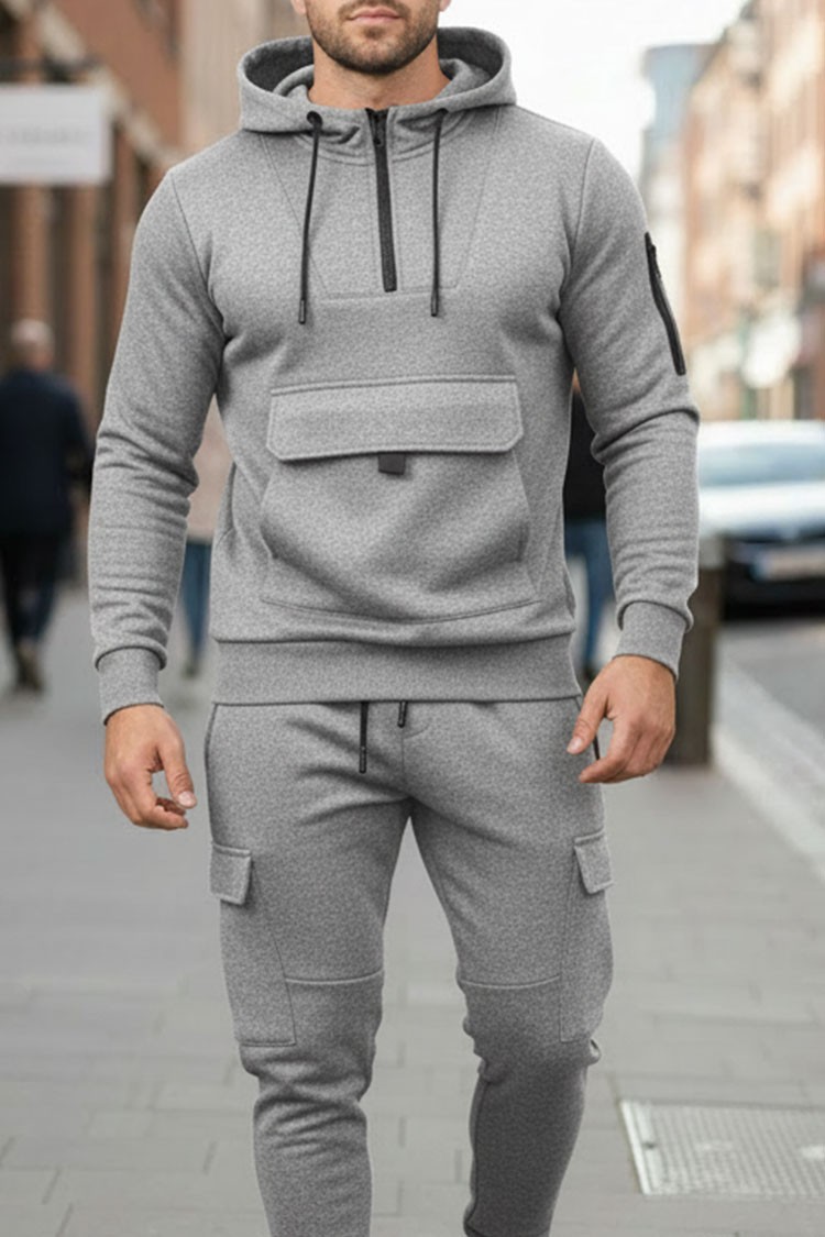 - Wygodny męski komplet w kolorze czarnym, składający się z bluzy z kapturem i spodni.