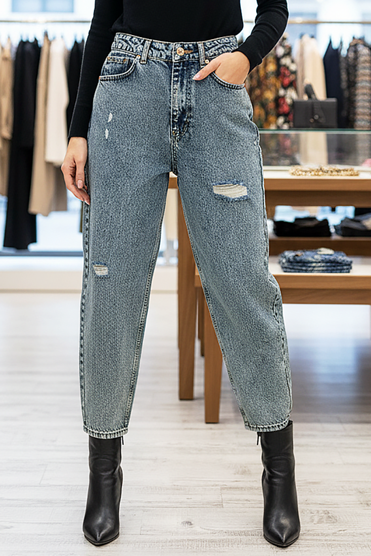 - Model ma wysoki stan, nowoczesny efekt przetarcia i klasyczny niebieski wzór.