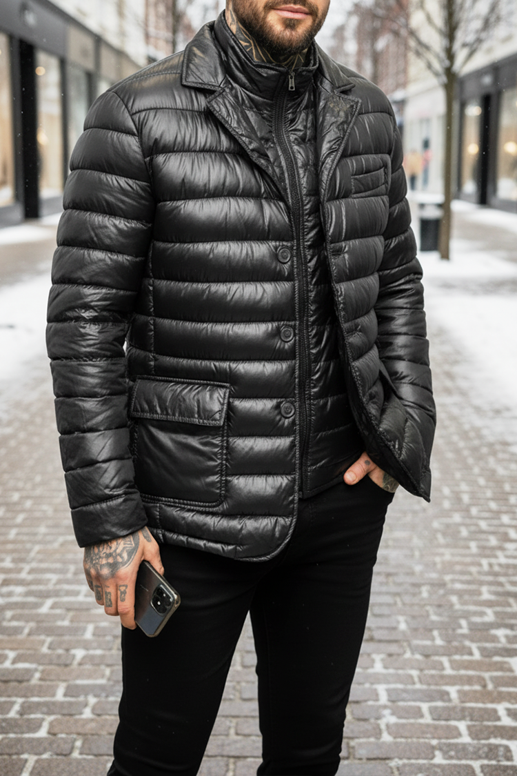 - Wygodna męska kurtka z poziomym, pikowanym wzorem i klapami w kolorze czarnym, o sportowym, codziennym stylu.