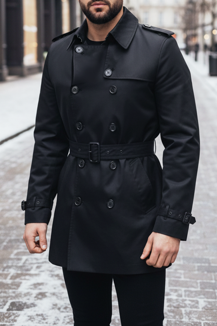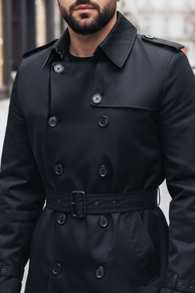 - Stylowy trencz z kołnierzem i paskiem w kolorze czarnym, który musisz mieć w swojej garderobie.