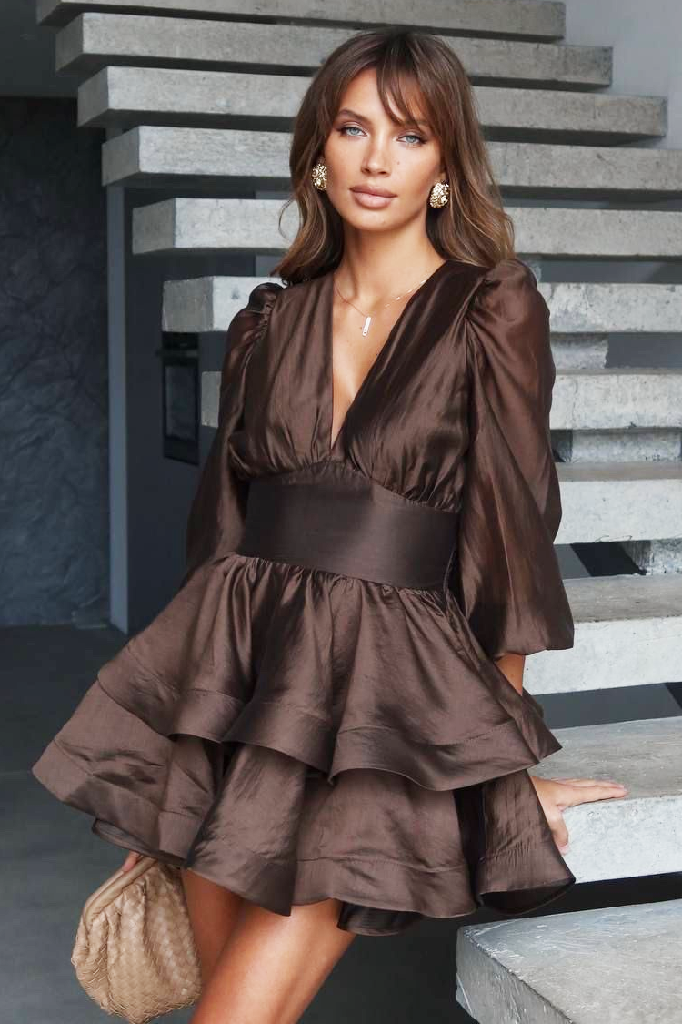 - Wybierz tę sukienkę mini w kolorze brązowym, idealną na każdąspecjalną okazję i imprezę.