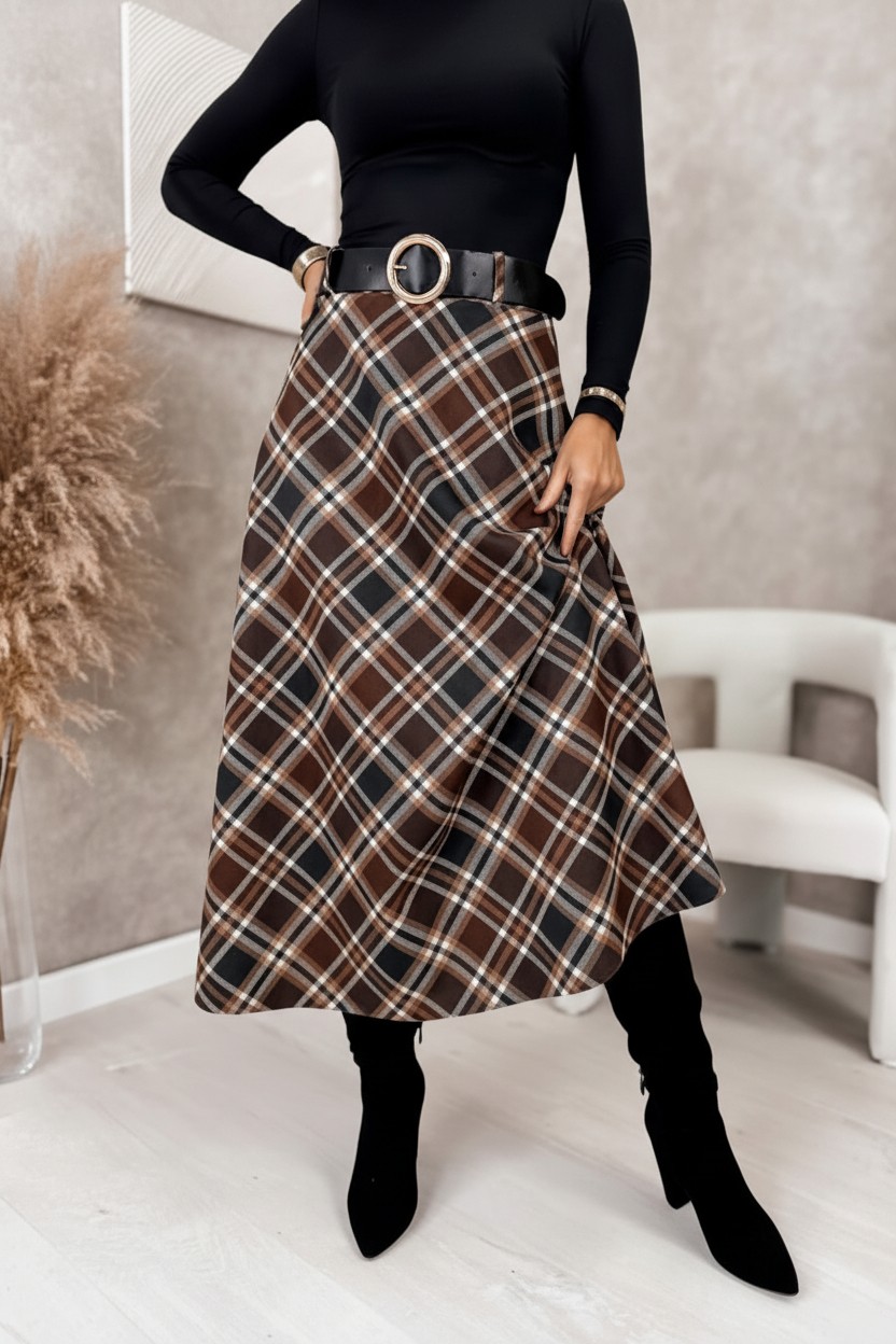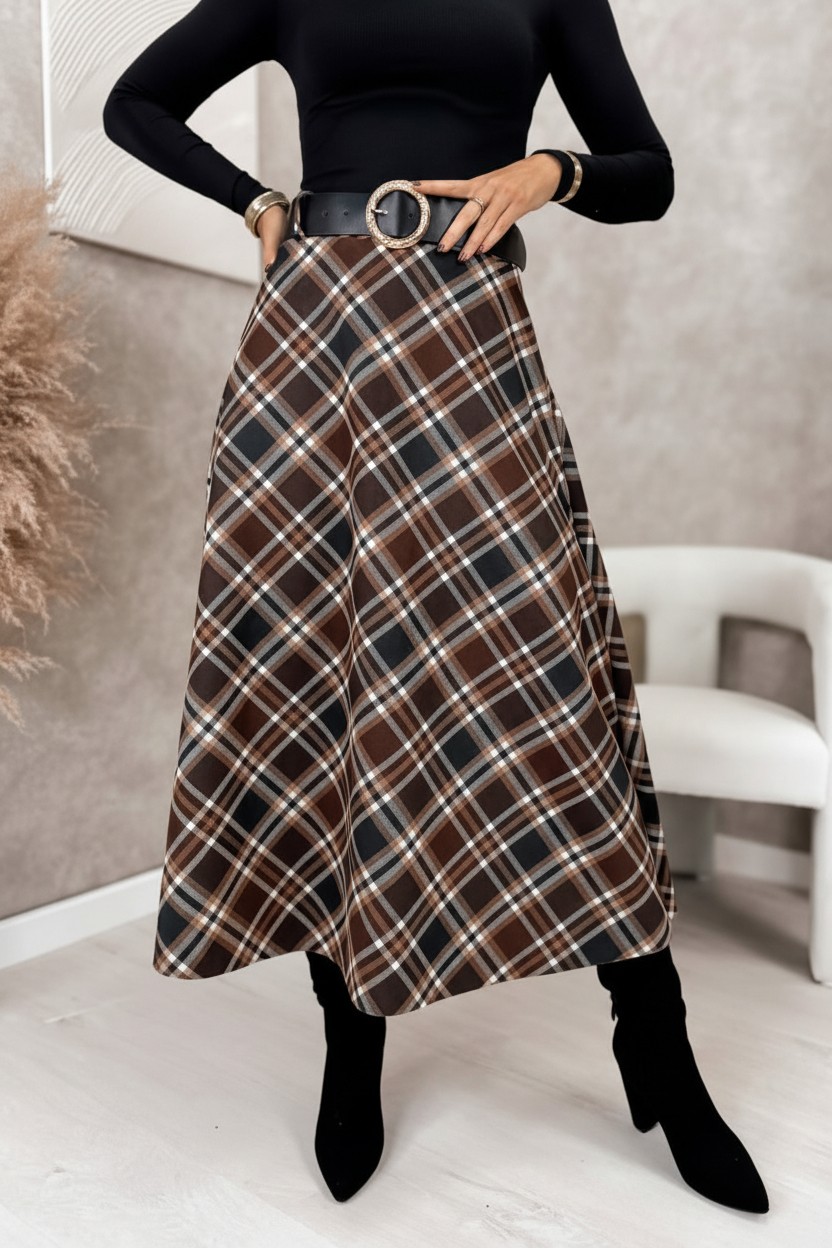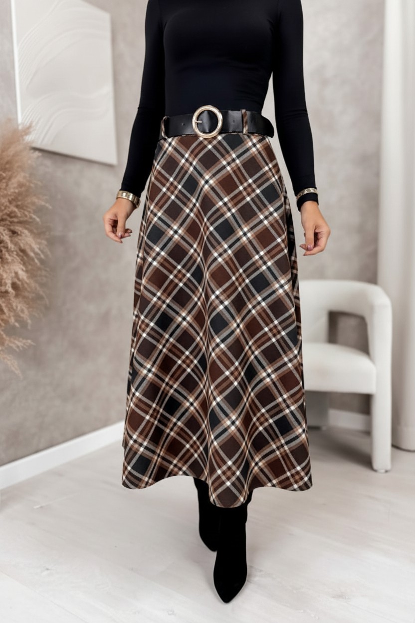- Model ma wysoki stan, pasek z eko skóry i efektowny wzór w kratkę.