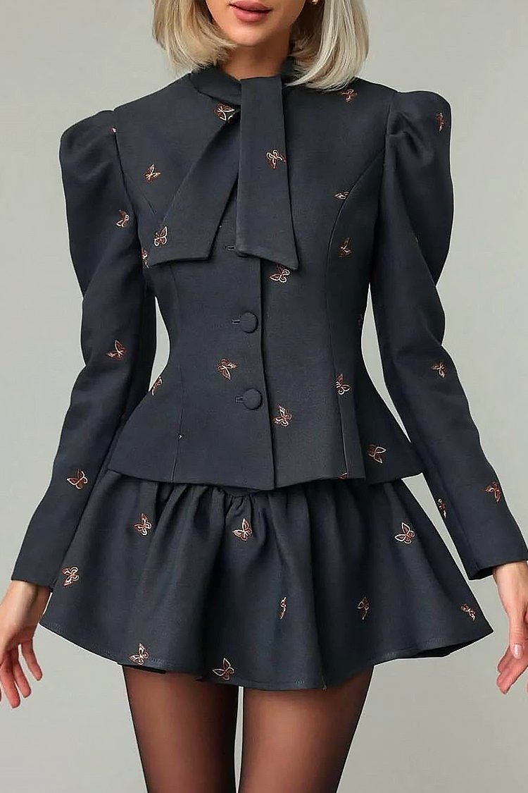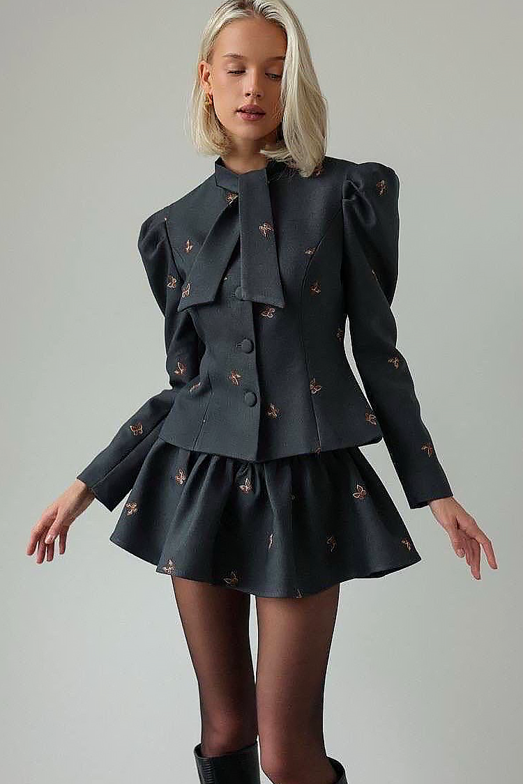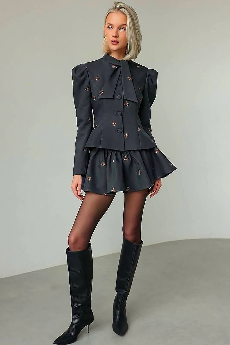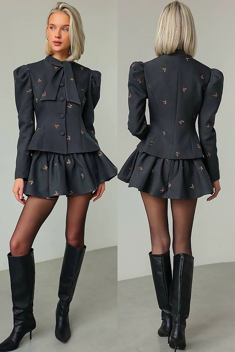 - Spódnica jest krótka i ma falbanki, a żakiet ma duże guziki, bufiaste rękawy i wiązanie przy dekolcie.