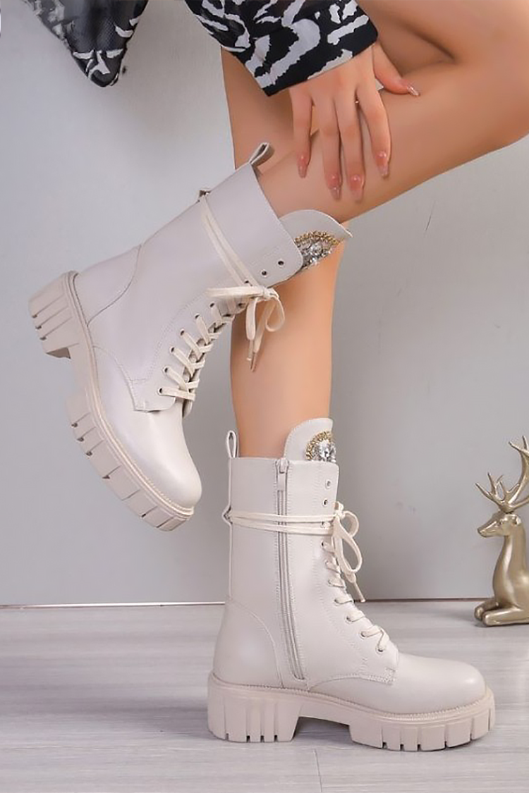 - Aby czuć się komfortowo, ale i stylowo, wybierz te damskie botki w kolorze ecru.