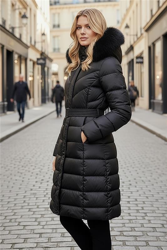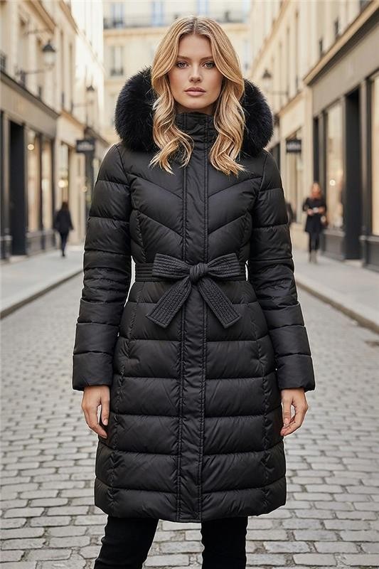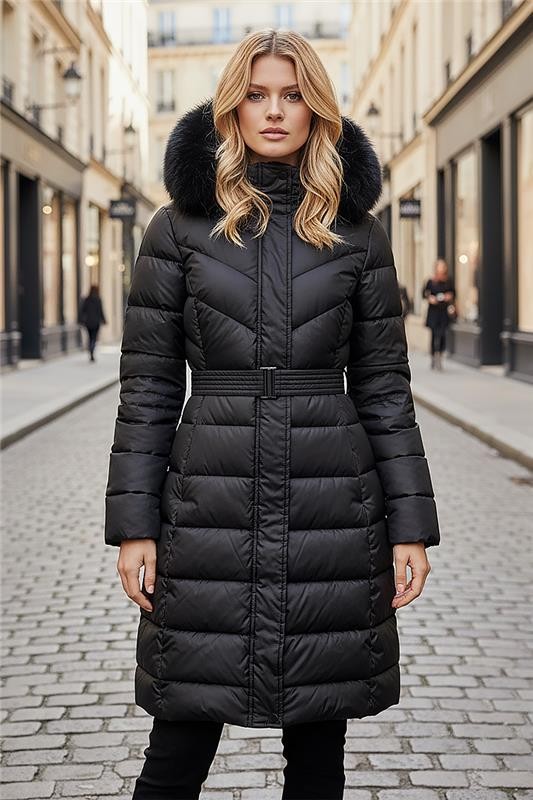- Model maluźny krój, długi fason, praktyczne kieszenie i puchowy kaptur.
