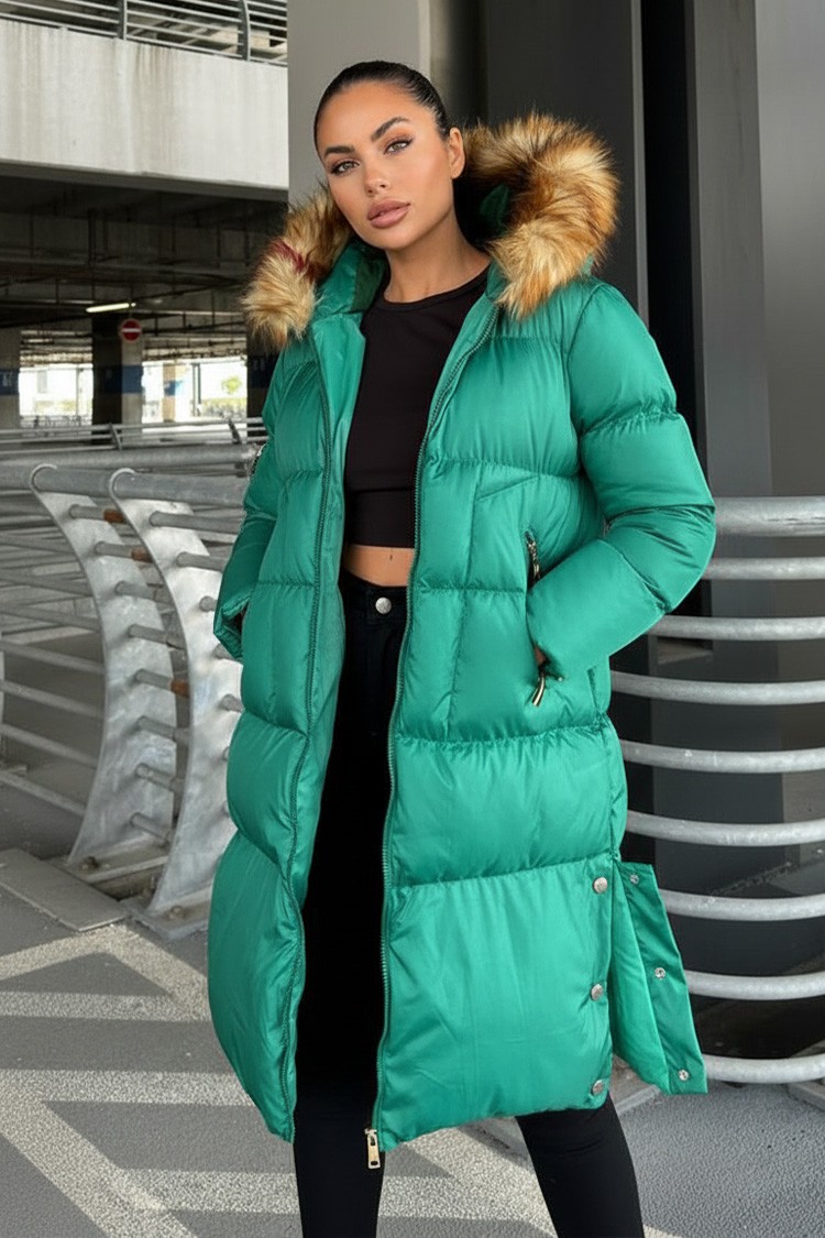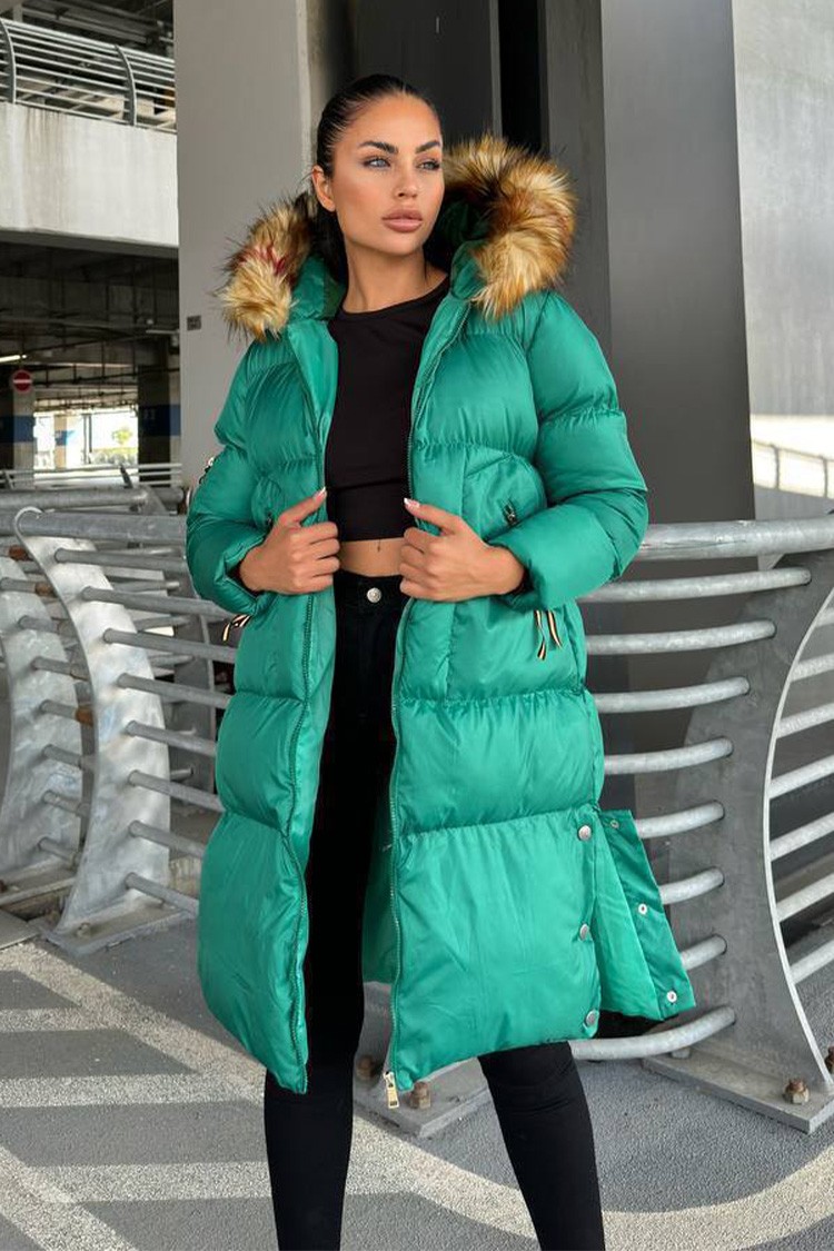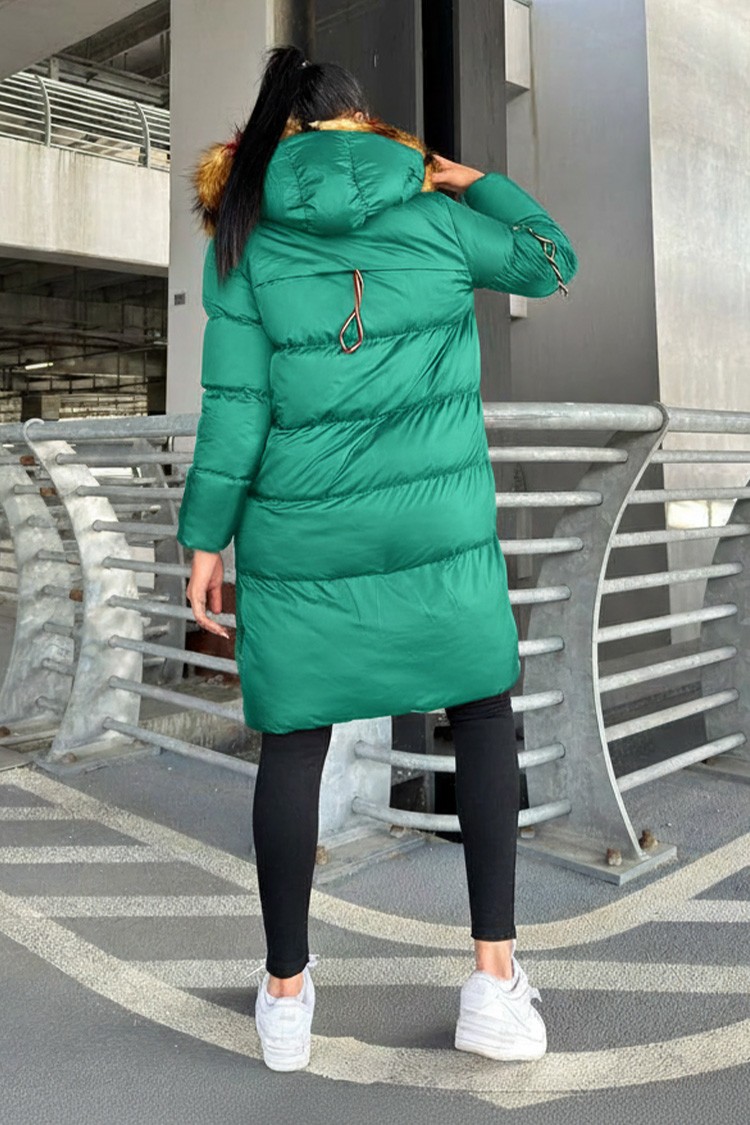 - Model ma wygodny krój, kaptur z puchem i kieszenie boczne zapinane na zamek.