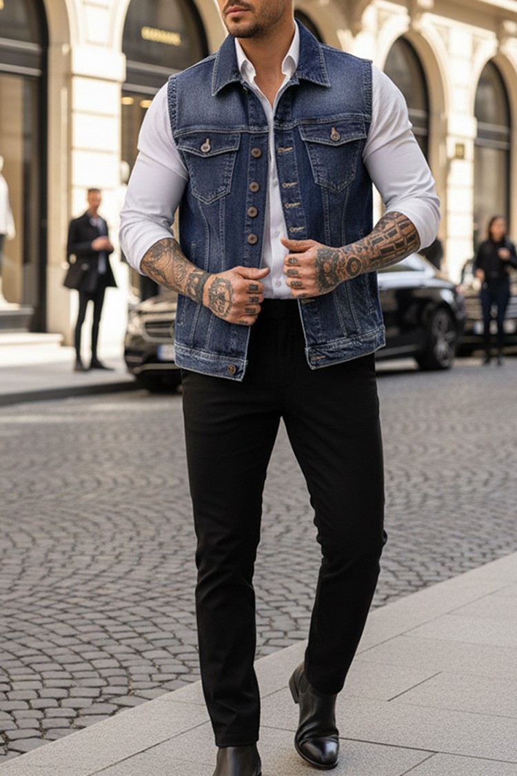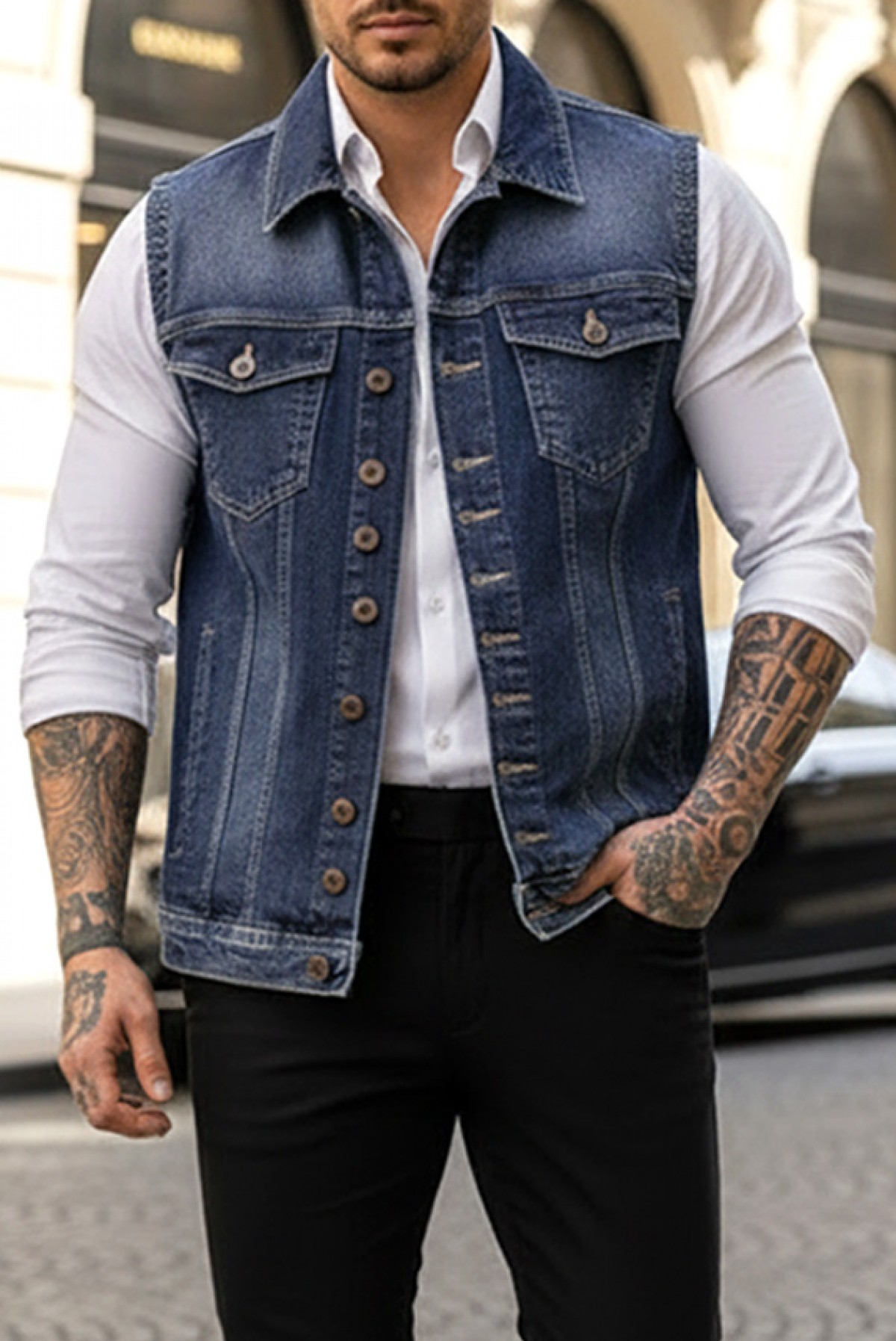- Praktyczna męska kamizelka o luźnym kroju w kolorze niebieskim, pasująca do różnych stylizacji.