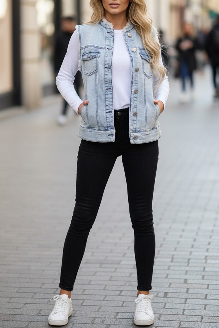 - Nowoczesna damska kamizelka jeansowa w kolorze jasnoniebieskim z efektem wybielenia, pasująca do różnych stylizacji.