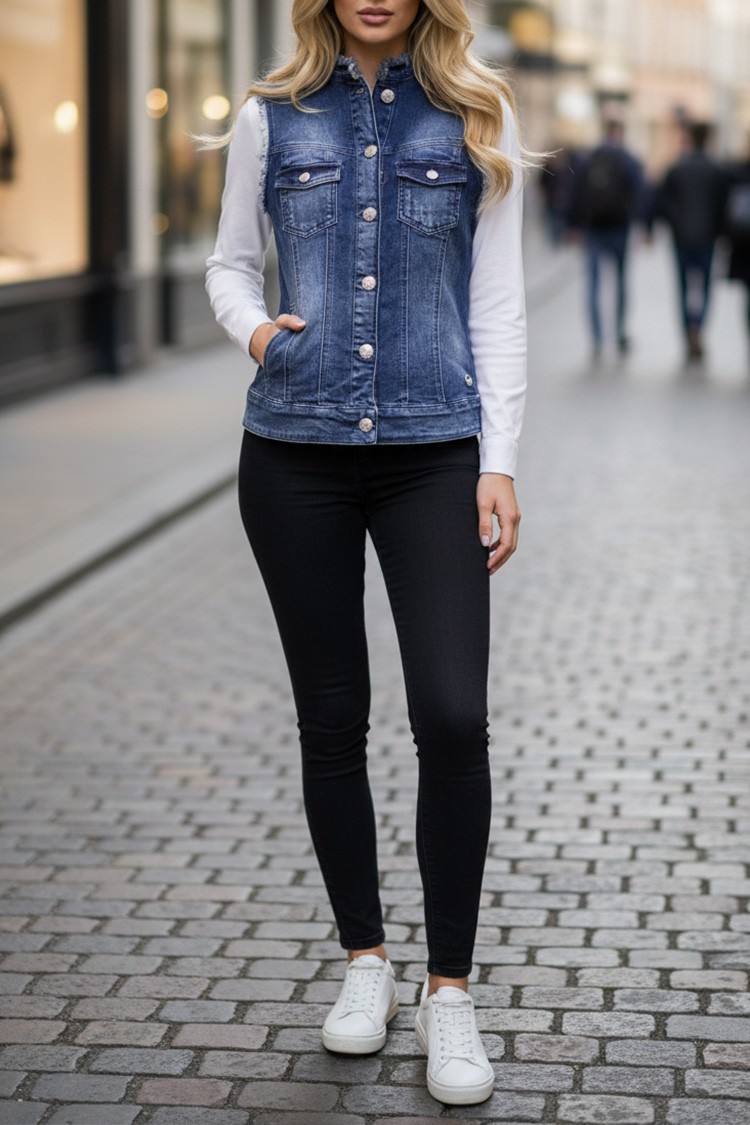 - Nowoczesna damska kamizelka jeansowa w kolorze granatowym z efektem wybielenia, pasująca do różnych stylizacji.