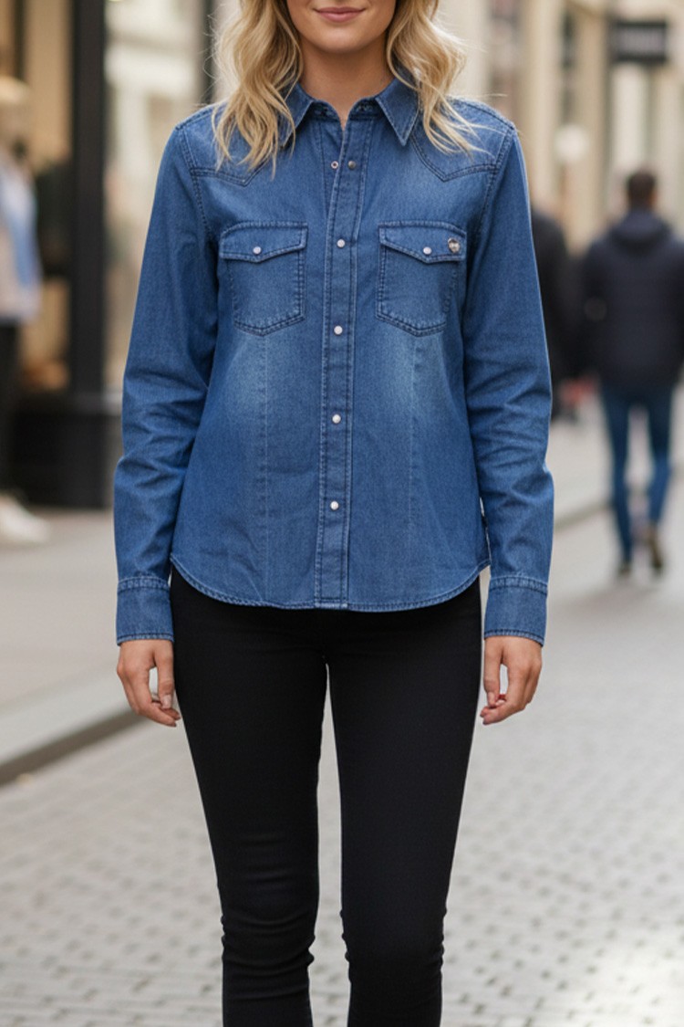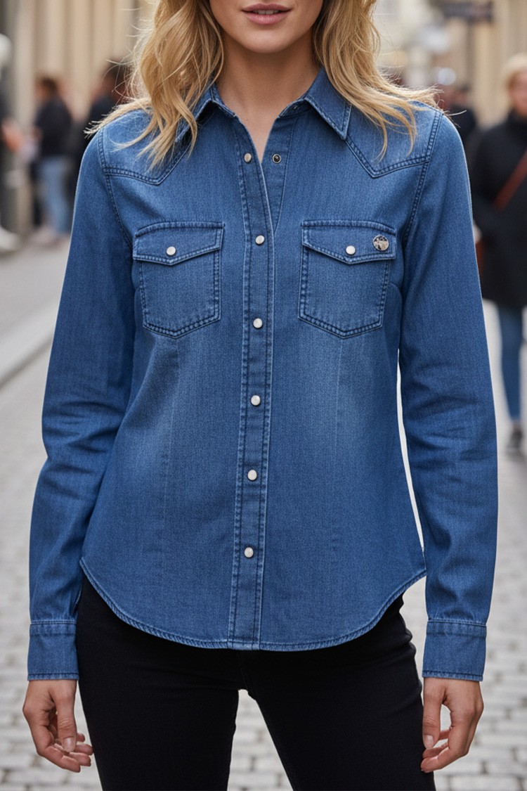 - Praktyczna damska koszula o prostym kroju, z kieszeniami z patkami i zapięciem na haftki, pasująca do różnych stylizacji.