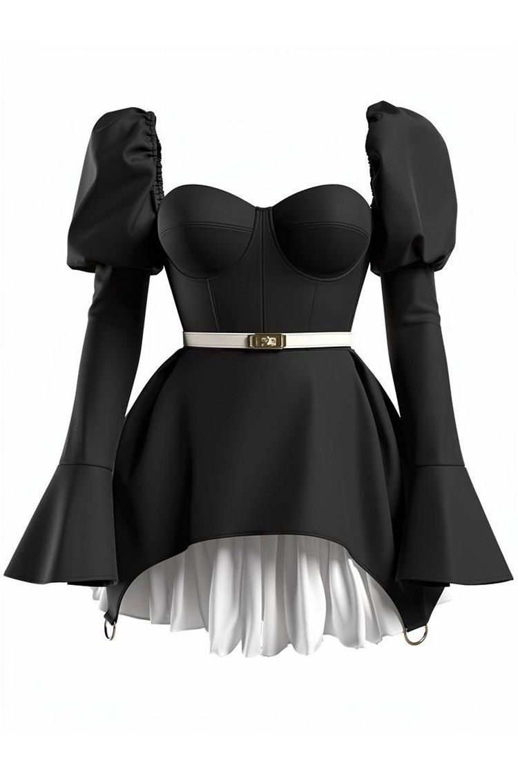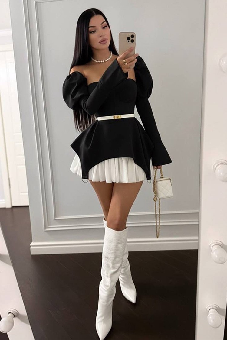 - Sukienka ma efektowny dekolt, eleganckie długie rękawy i piękną, efektowną podszewkę.