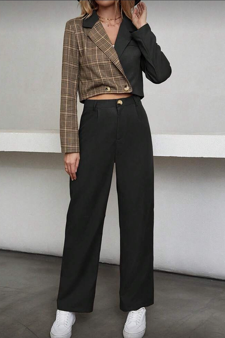 - Spodnie mają wysoki stan i szerokie nogawki, a marynarka ma skrócony krój i atrakcyjny wzór.