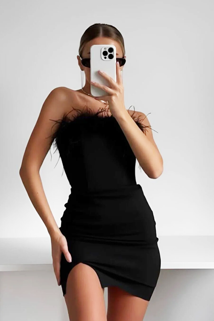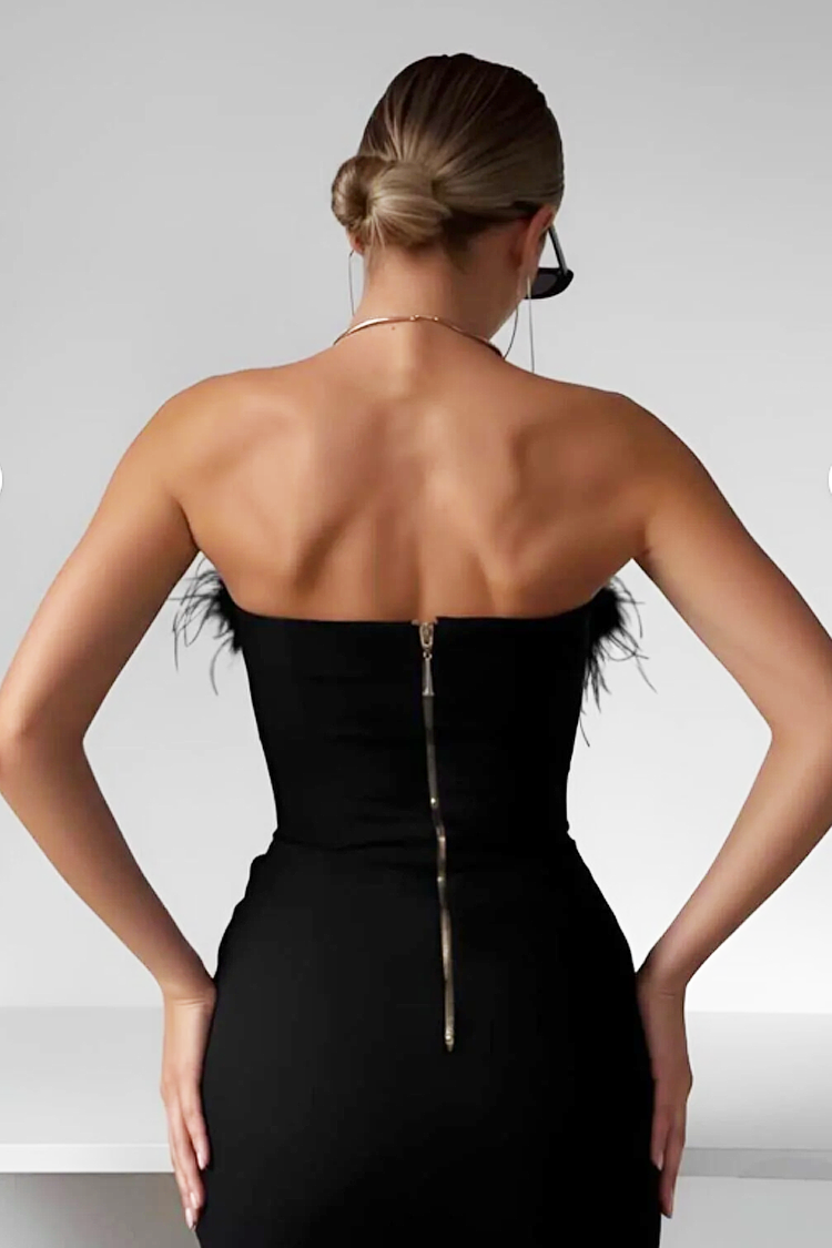 - Model ma dopasowany krój, czarny kolor i seksowny dekolt z piórami.